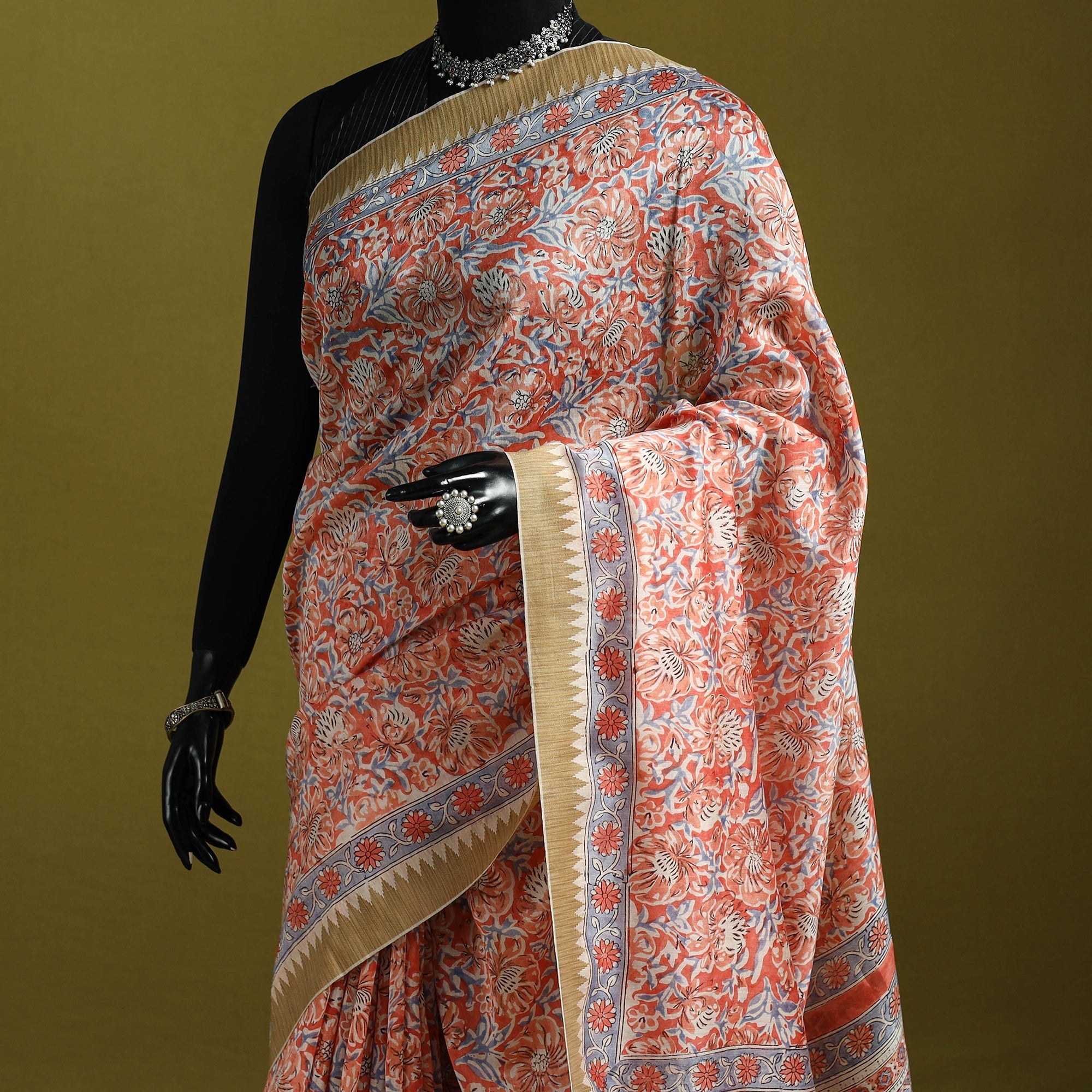 Orange chanderi silk cotton saree showcases the elegance of sanganeri hand block printing, known for its fine motifs and delicate detailing. Each pattern is printed using wooden blocks, reflecting the charm of Rajasthan’s printing heritage. Its subtle sheen complements the textured ghicha border, adding depth and character. Blending traditional appeal with a contemporary touch, it is a graceful choice for occasions and brings thoughtful detailing and visual interest to any wardrobe.