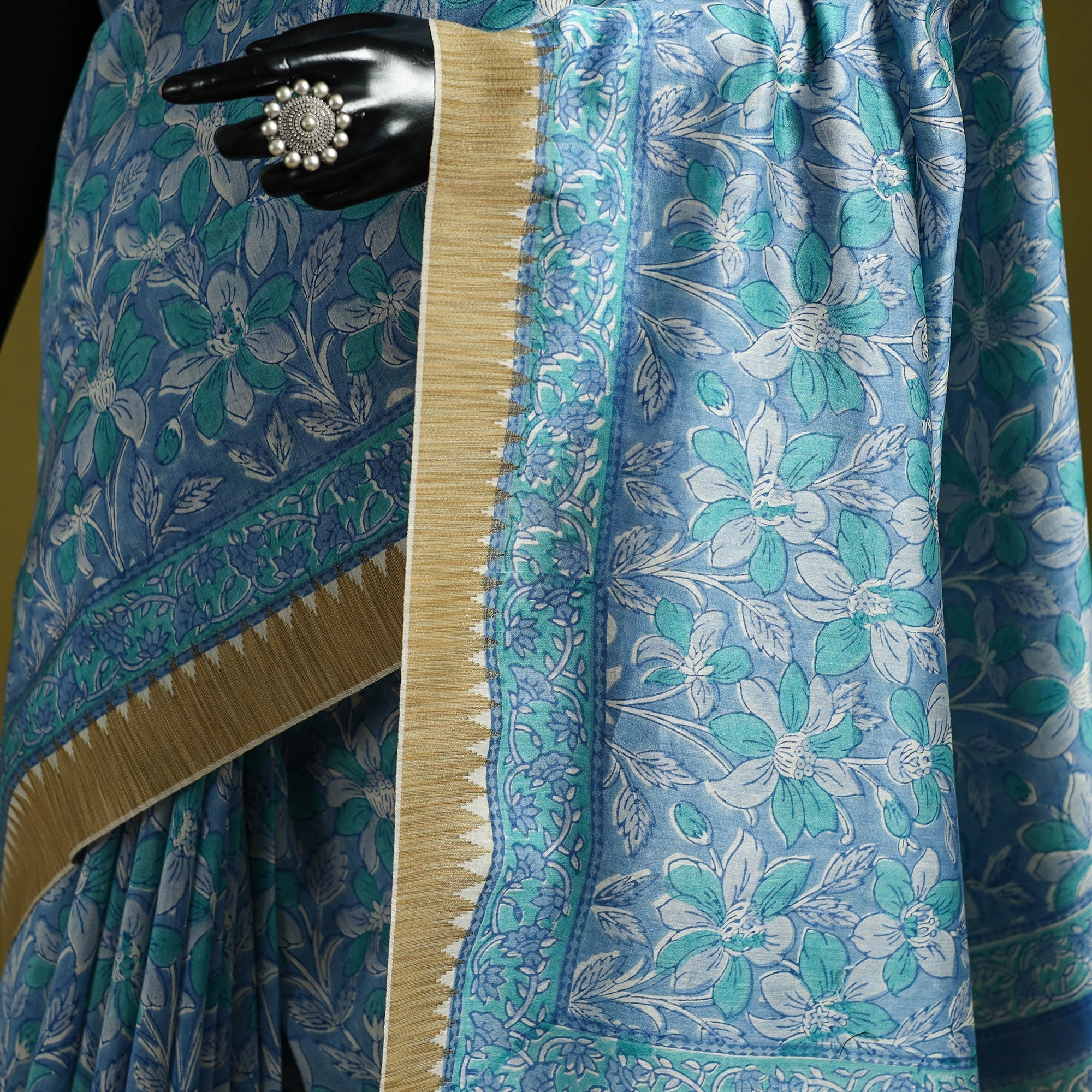 Blue - Chanderi Silk Hand Block Print Sanganeri Saree with Ghicha Border 24
