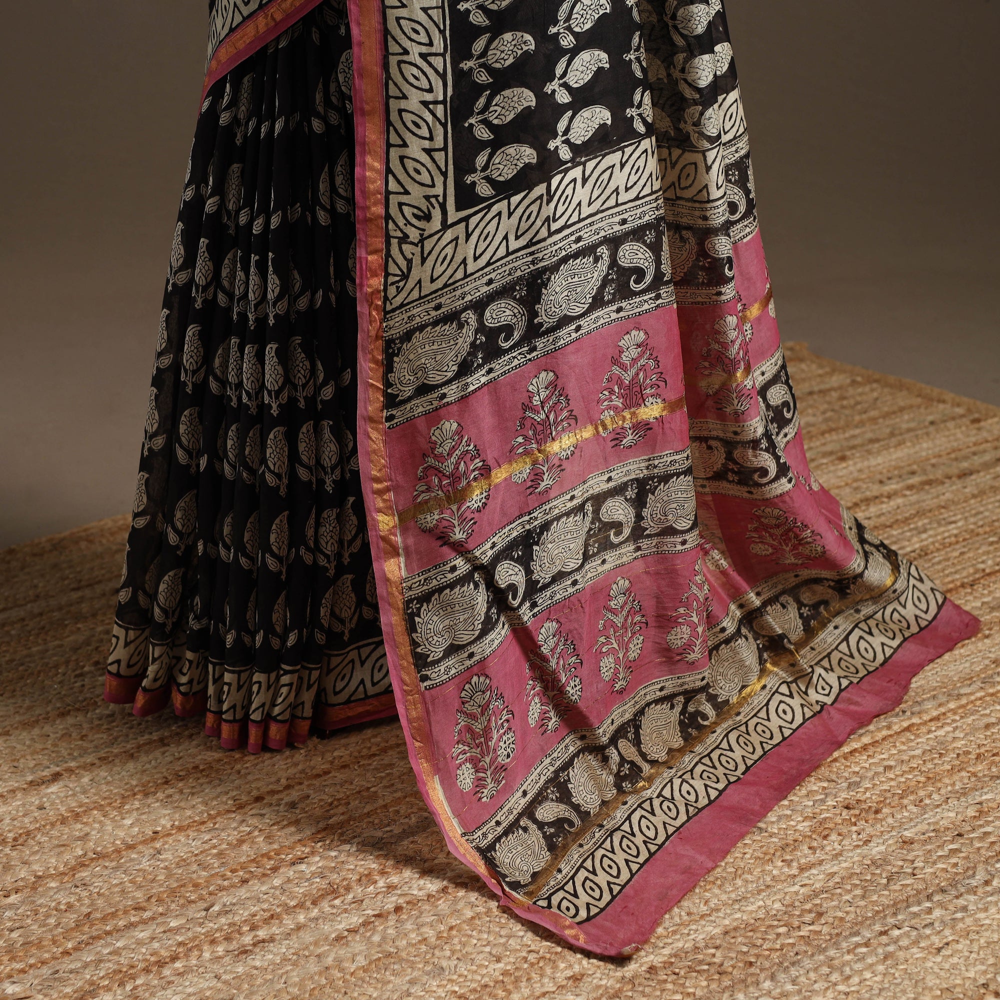 | Material | Black hand block-printed sanganeri chanderi silk cotton saree with a zari border, adorned with intricate patterns and rich colours dyed using vat dyes. Blending elegance with cultural heritage, it is perfect for festive occasions, everyday wear or as a thoughtful gift. This saree adds timeless grace and an artisanal touch to any wardrobe. |