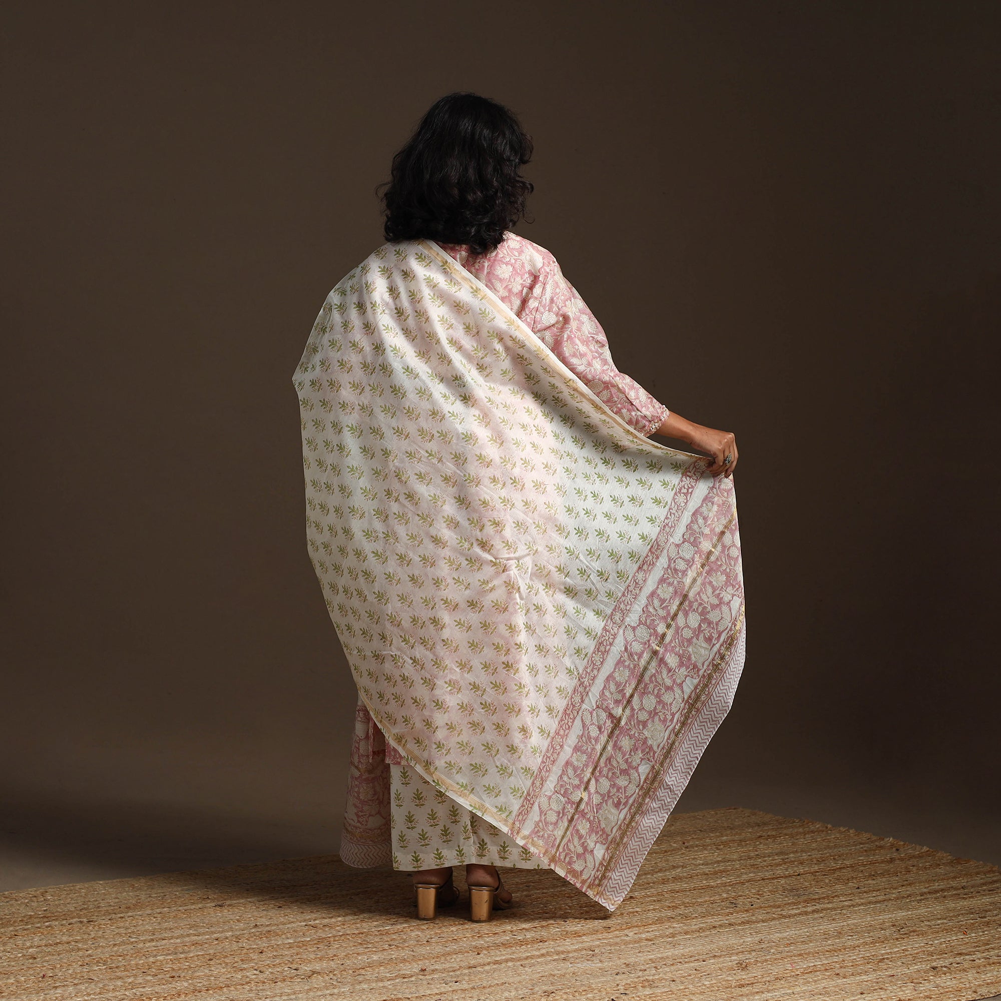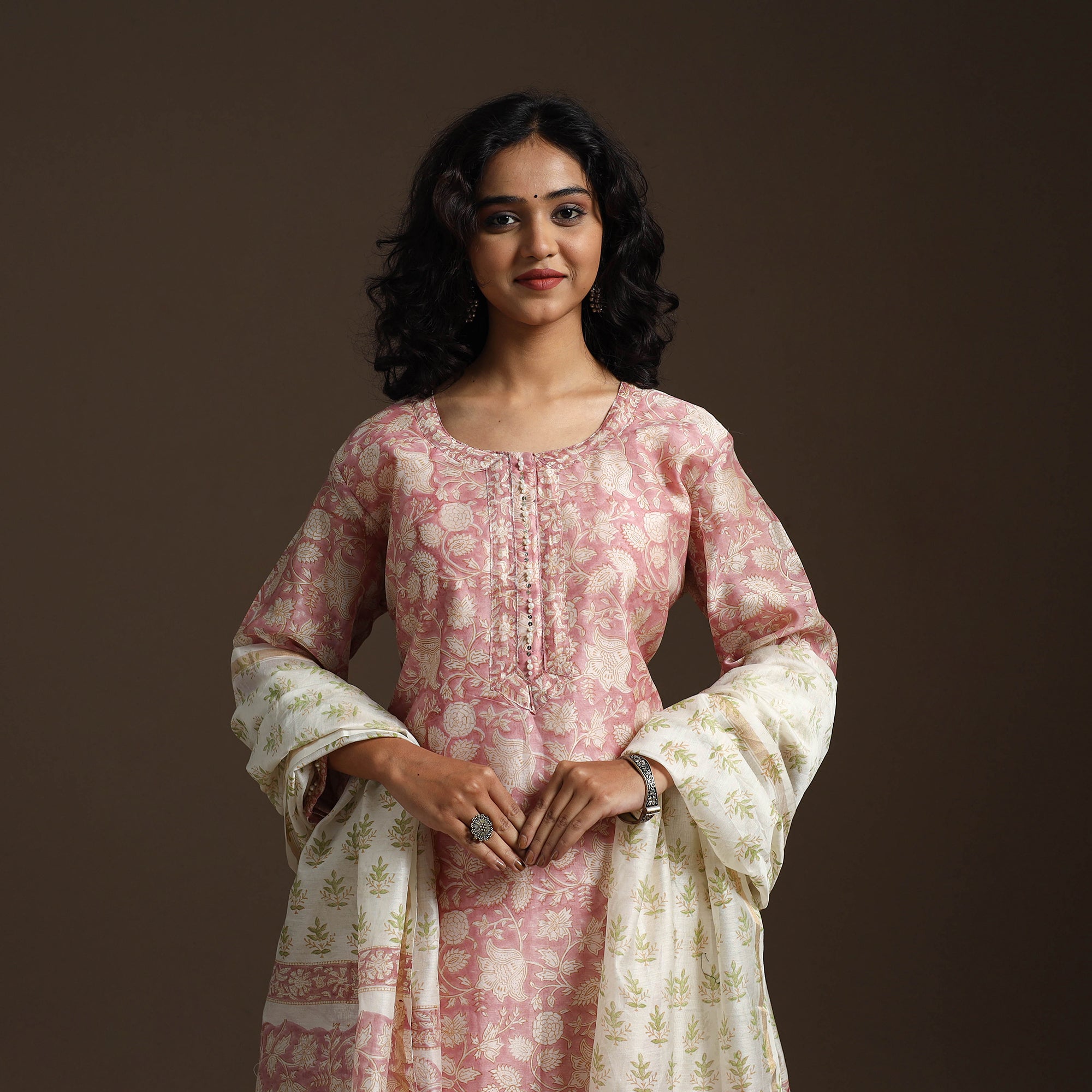 Pink hand embroidery chanderi silk cotton suit set features traditional sanganeri block printing from Rajasthan known for its fine floral patterns. Made using hand carved wooden blocks. Includes straight kurta with side pocket cotton palazzo with elastic waist and pockets and a matching dupatta. Perfect for both daily wear and special moments, it beautifully combines comfort and charm.