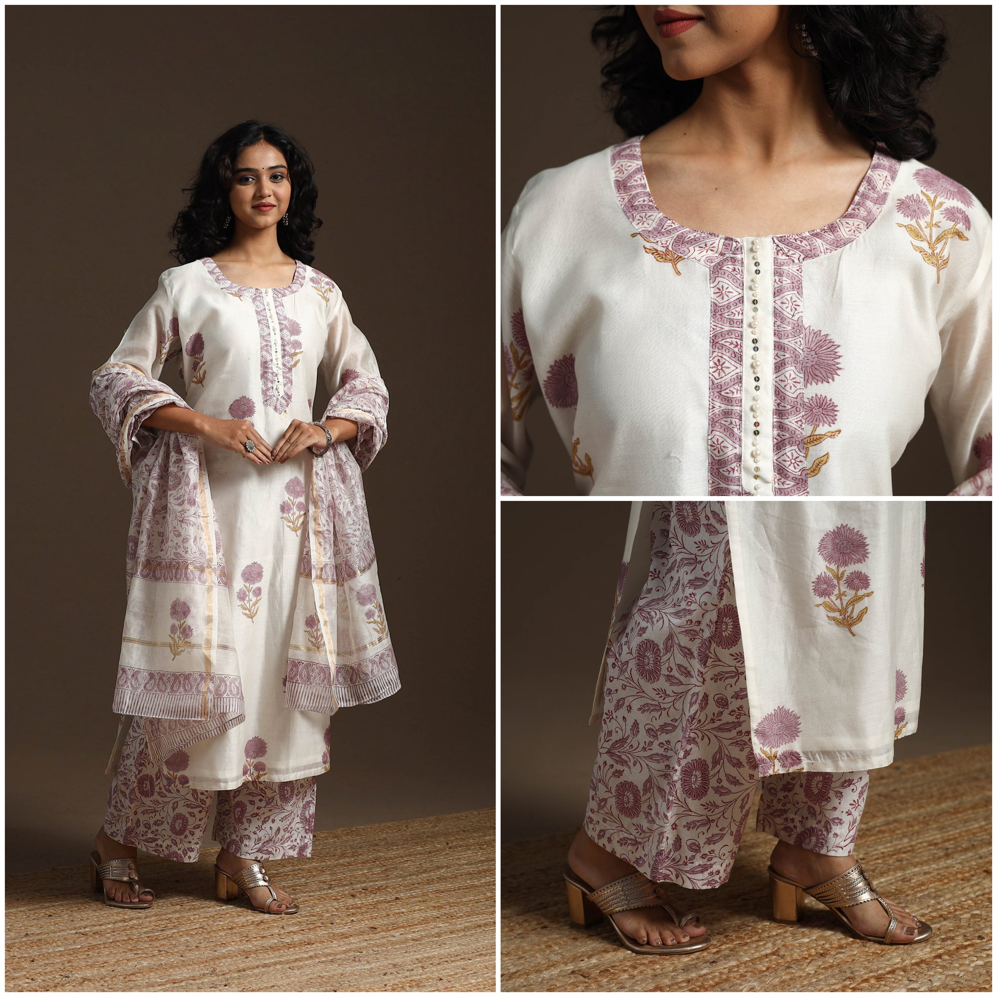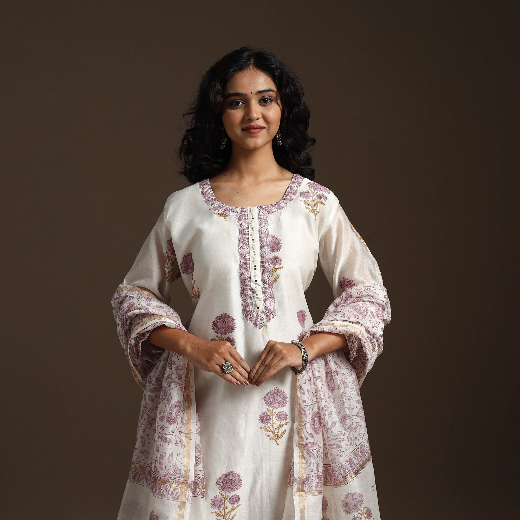 White hand embroidery chanderi silk cotton suit set features traditional sanganeri block printing from Rajasthan known for its fine floral patterns. Made using hand carved wooden blocks. Includes straight kurta with side pocket cotton afghani salwar with elastic waist and drawstring and a matching dupatta. Perfect for both daily wear and special moments, it beautifully combines comfort and charm.