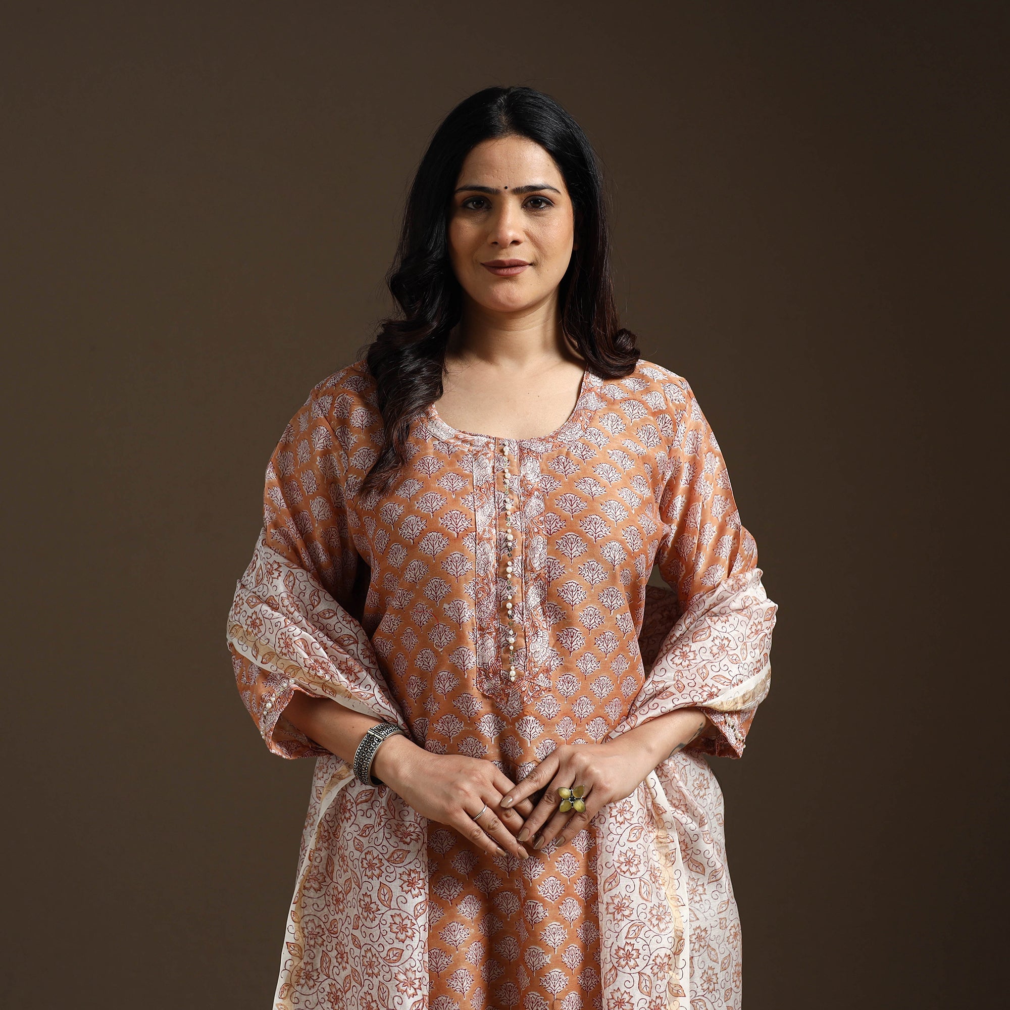 | Material | Brown hand embroidery chanderi silk cotton suit set features traditional sanganeri block printing from Rajasthan known for its fine floral patterns. Made using hand carved wooden blocks. Includes straight kurta with side pocket cotton afghani salwar with elastic waist and drawstring and a matching dupatta. Perfect for both daily wear and special moments, it beautifully combines comfort and charm. |