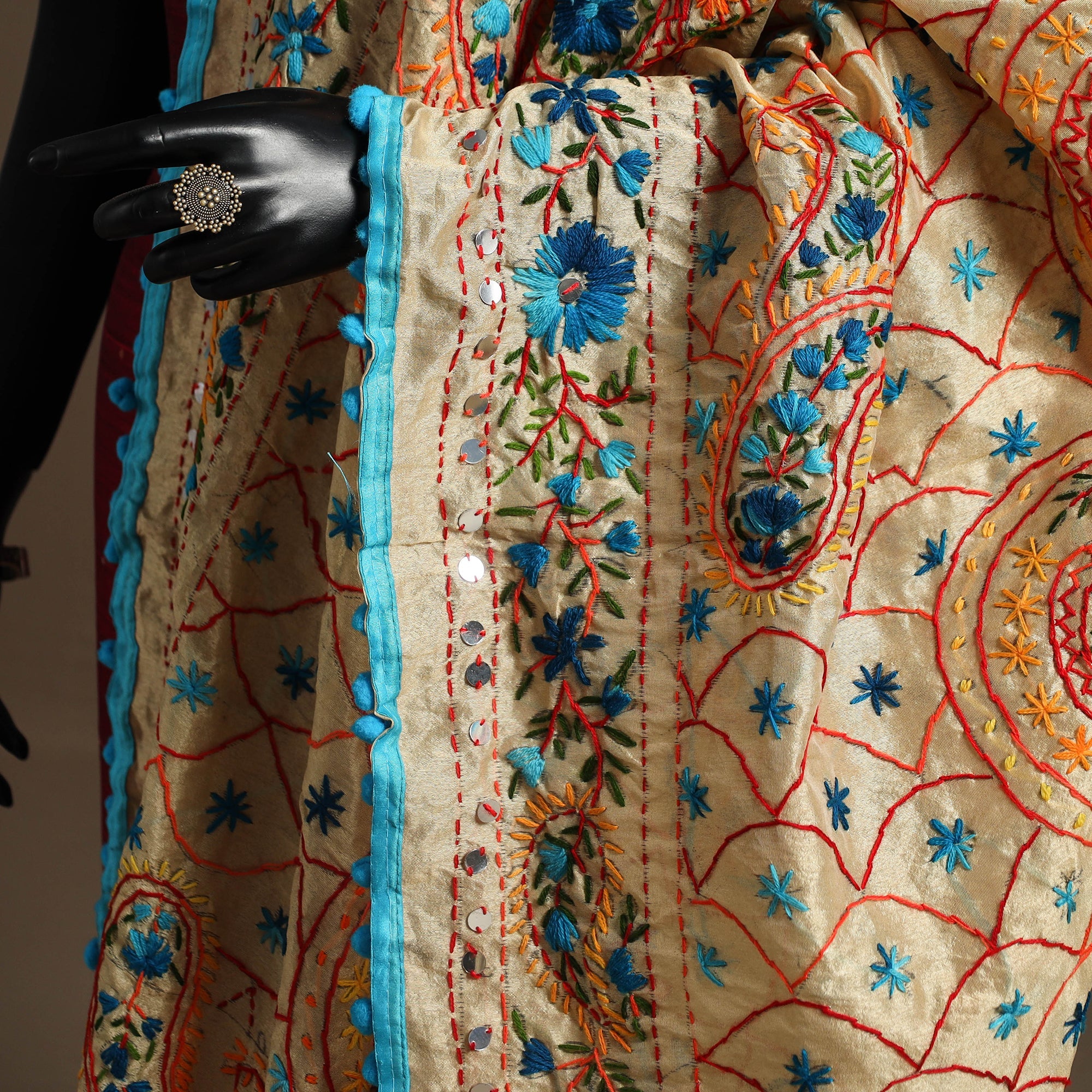 Add authenticity to your attire with this exquisite blue hand-embroidered chanderi silk phulkari dupatta with pom-pom. Featuring traditional chapa work and intricate hand embroidery, it reflects the vibrant heritage of Punjab. This multicolour phulkari dupatta complements both traditional and modern outfits, instantly enhancing your look with its detailed craftsmanship and cultural charm.