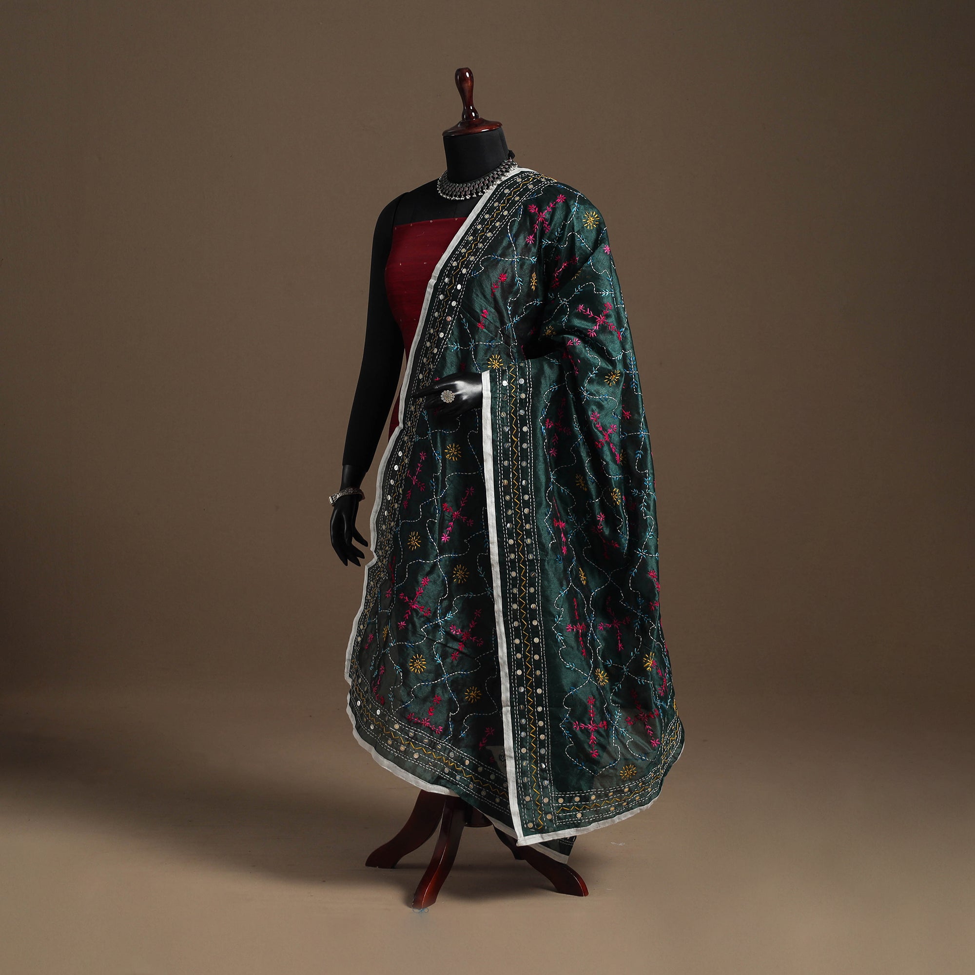 Add authenticity to your attire with this exquisite green hand-embroidered chanderi silk phulkari dupatta. Featuring traditional chapa work and intricate hand embroidery, it reflects the vibrant heritage of Punjab. This multicolour phulkari dupatta complements both traditional and modern outfits, instantly enhancing your look with its detailed craftsmanship and cultural charm.