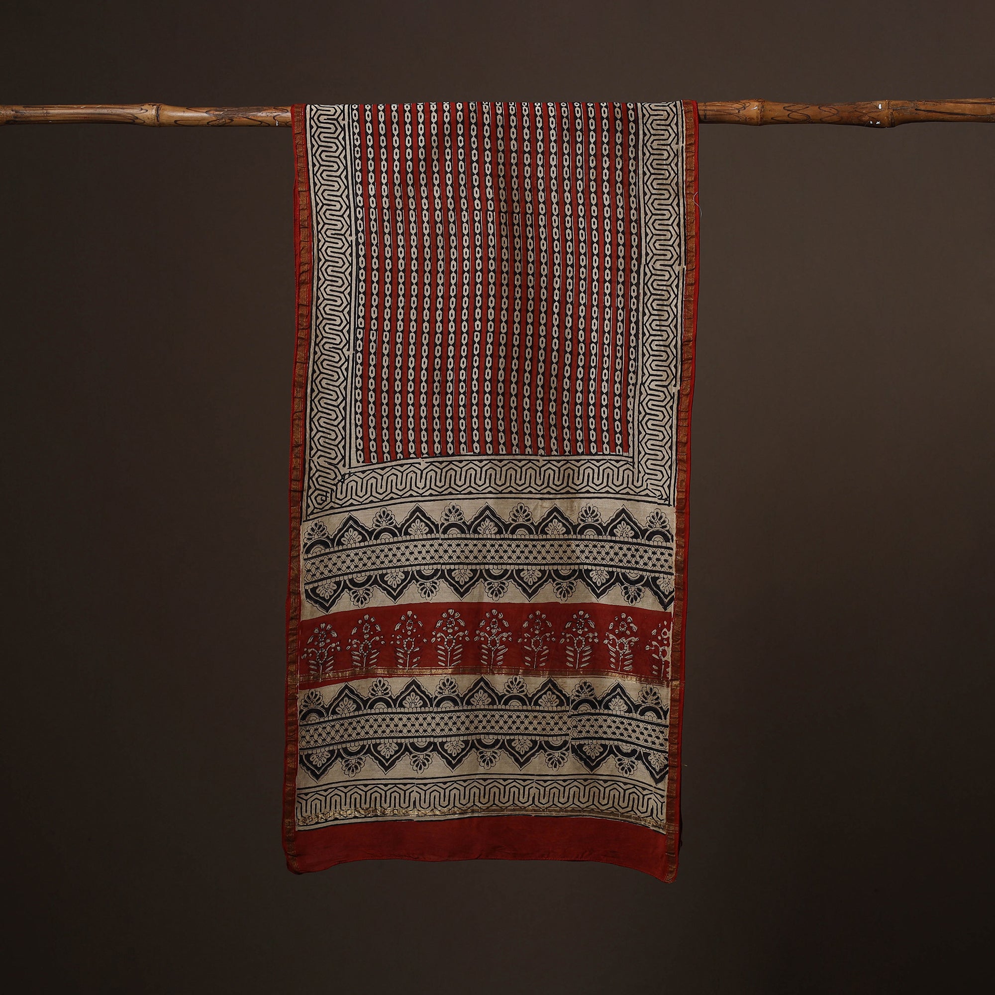 Red bagru hand block printed chanderi silk stole with zari border, crafted using natural dyes through the traditional mud-resist process with hand-carved wooden blocks practiced in Bagru, Rajasthan. Its light, airy chanderi texture drapes beautifully, making it perfect for both everyday wear and special occasions. This stole adds a graceful touch to any outfit.