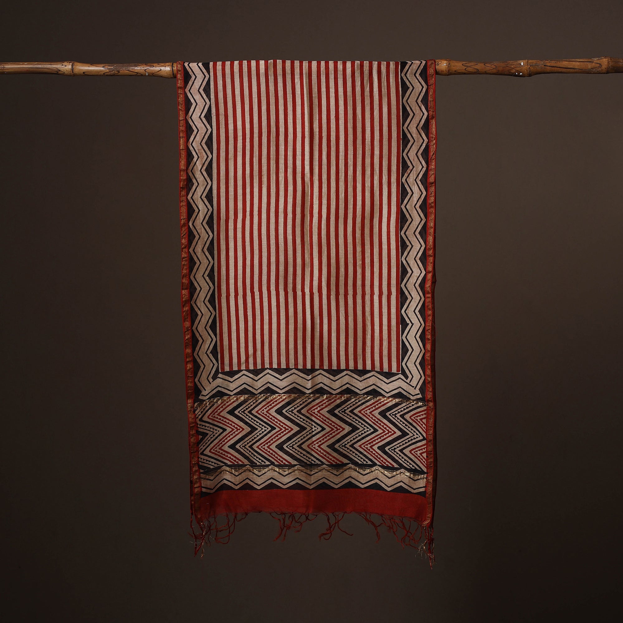Red bagru hand block printed chanderi silk stole with zari border, crafted using natural dyes through the traditional mud-resist process with hand-carved wooden blocks practiced in Bagru, Rajasthan. Its light, airy chanderi texture drapes beautifully, making it perfect for both everyday wear and special occasions. This stole adds a graceful touch to any outfit.