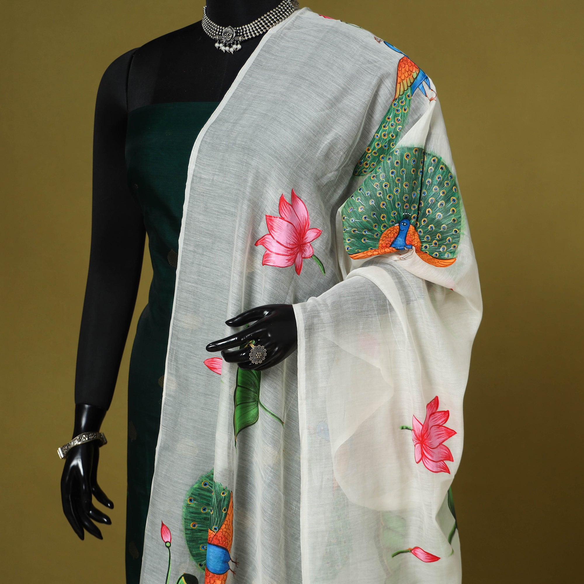 This white chanderi silk-cotton dupatta is inspired by the pichwai art of Rajasthan, known for its temple-inspired motifs. The dupatta features hand-painted designs of lotus (Padma), peacocks, cows, trees, and intricate mythological depictions that symbolize purity, grace, devotion, and storytelling. Crafted on fine silk-cotton, the artwork brings alive the traditional charm of Pichwai, making it perfect for festive occasions, cultural gatherings, and celebrations with heritage appeal.
