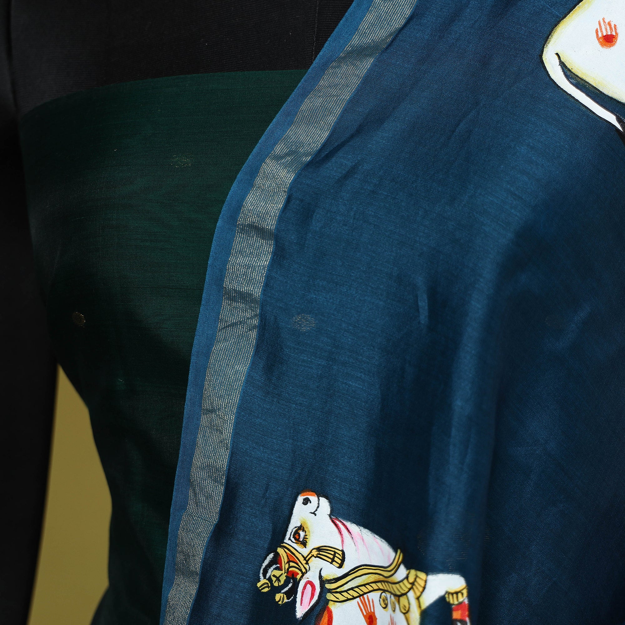 This blue chanderi silk-cotton dupatta is inspired by the pichwai art of Rajasthan, known for its temple-inspired motifs. The dupatta features hand-painted designs of lotus (Padma), peacocks, cows, trees, and intricate mythological depictions that symbolize purity, grace, devotion, and storytelling. Crafted on fine silk-cotton, the artwork brings alive the traditional charm of Pichwai, making it perfect for festive occasions, cultural gatherings, and celebrations with heritage appeal.