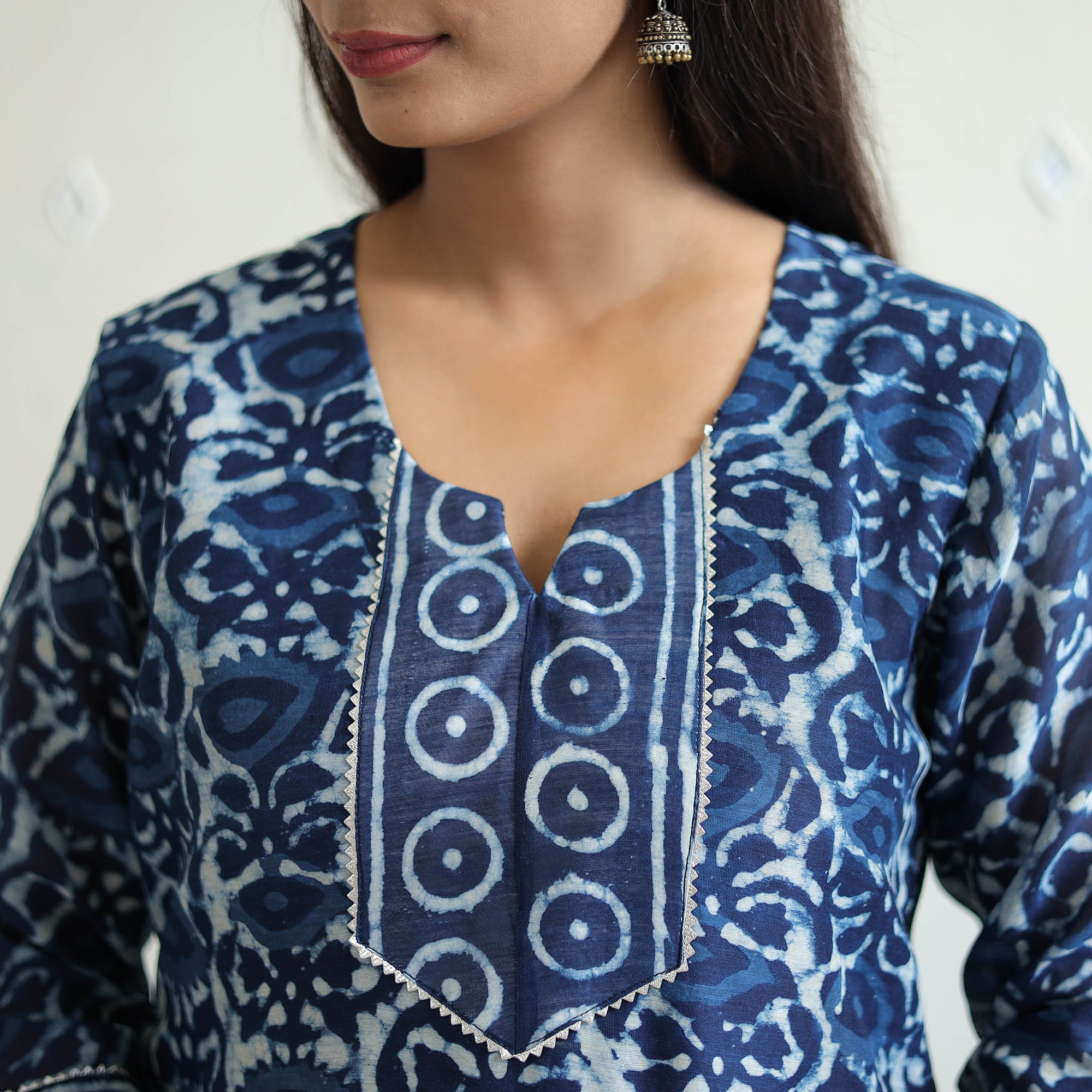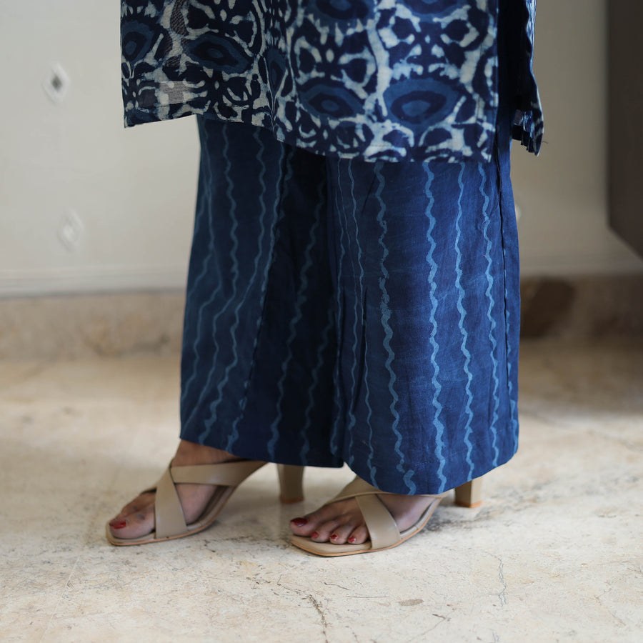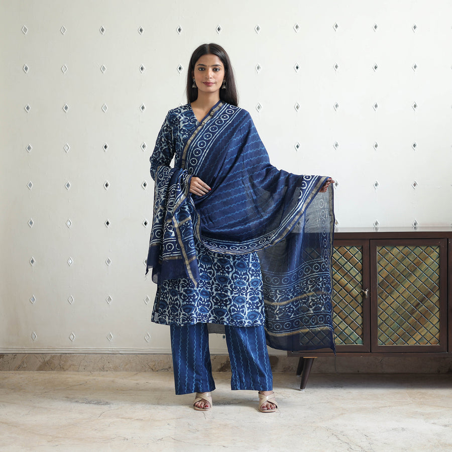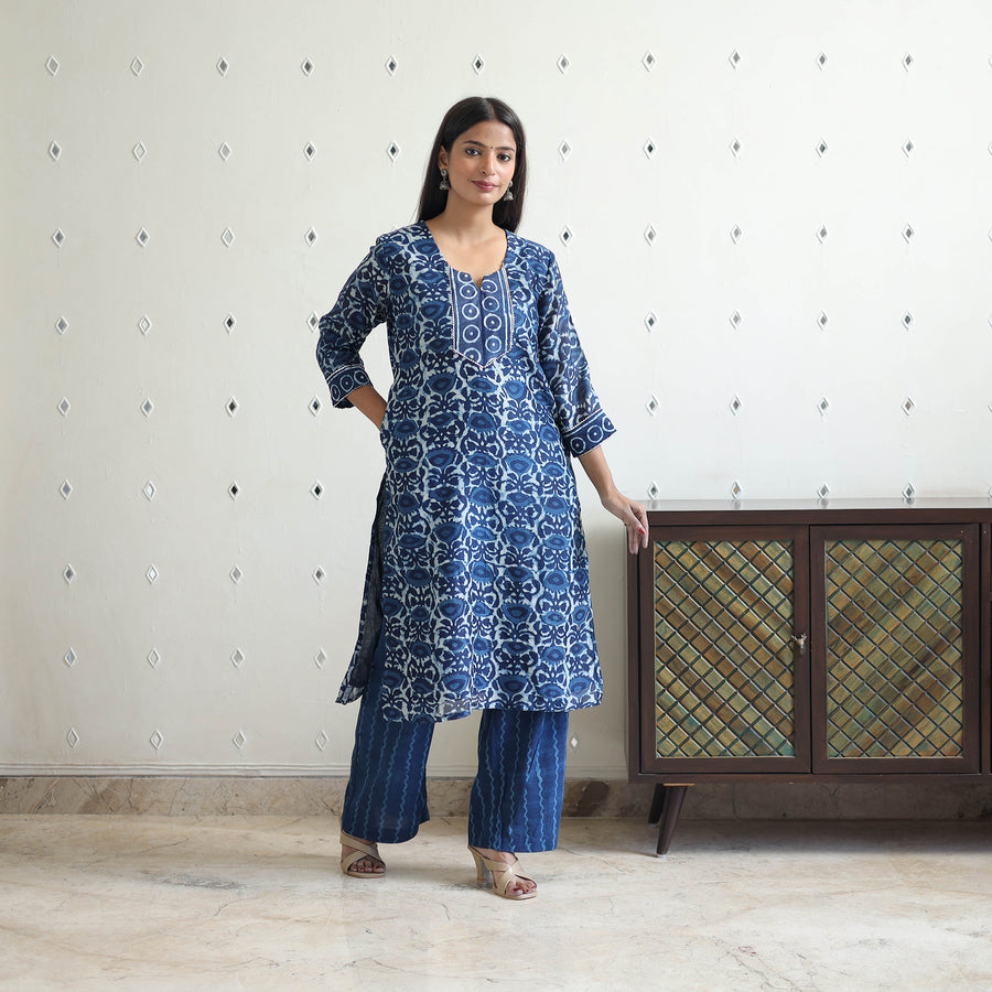 Experience traditional charm with this blue chanderi silk indigo bagru hand block print kurta set. This ensemble includes a stylish chanderi silk kurta with one side pocket, comfortable cotton palazzo with an elasticized waist & two side pockets, and a zari-bordered dupatta, all featuring traditional Bagru block print motifs. Each piece is handcrafted by skilled artisans, preserving traditional techniques. This suit is perfect for your daily outing and for a special occasion.