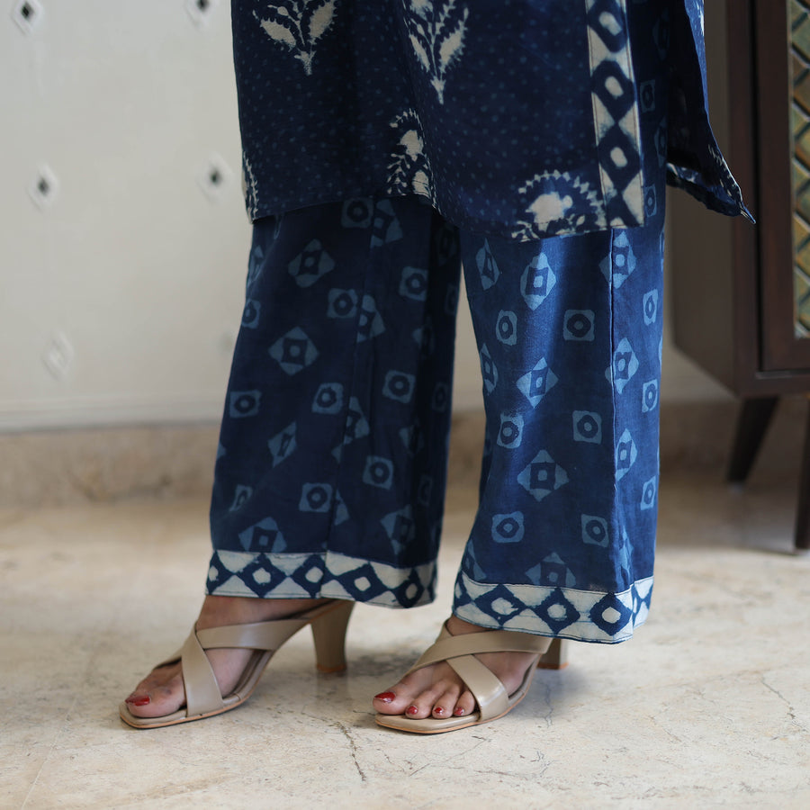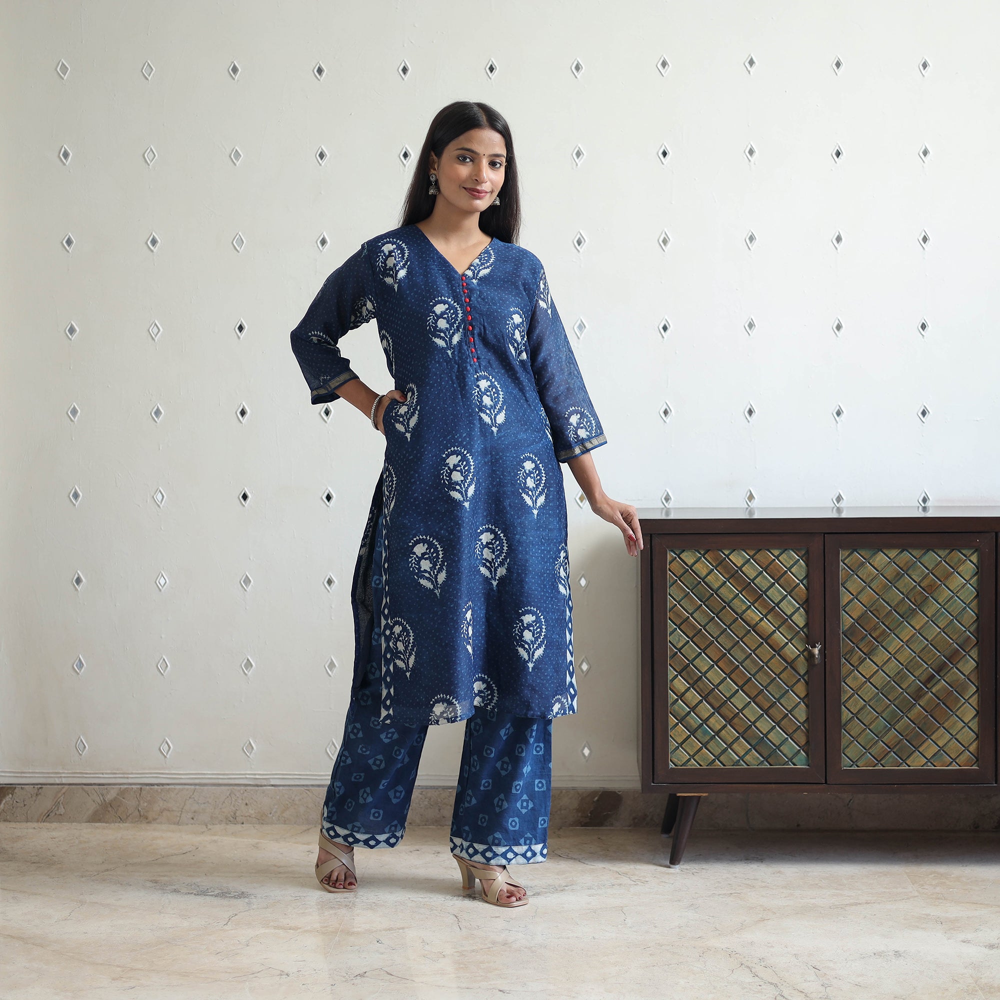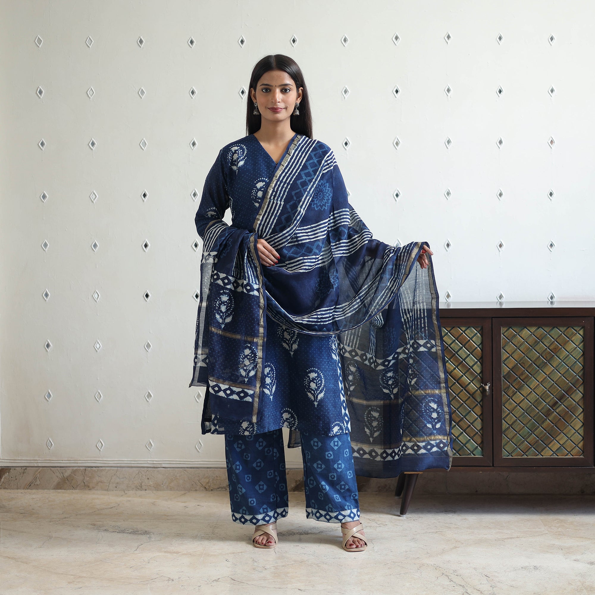 Experience traditional charm with this blue chanderi silk indigo bagru hand block print kurta set. This ensemble includes a stylish chanderi silk kurta with one side pocket, comfortable cotton palazzo with an elasticized waist & two side pockets, and a zari-bordered dupatta, all featuring traditional Bagru block print motifs. Each piece is handcrafted by skilled artisans, preserving traditional techniques. This suit is perfect for your daily outing and for a special occasion.