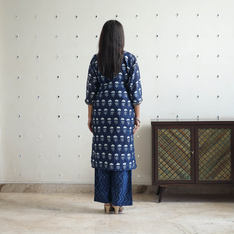 Experience traditional charm with this blue chanderi silk indigo bagru hand block print kurta set. This ensemble includes a stylish chanderi silk kurta with one side pocket, comfortable cotton palazzo with an elasticized waist & two side pockets, and a zari-bordered dupatta, all featuring traditional Bagru block print motifs. Each piece is handcrafted by skilled artisans, preserving traditional techniques. This suit is perfect for your daily outing and for a special occasion.