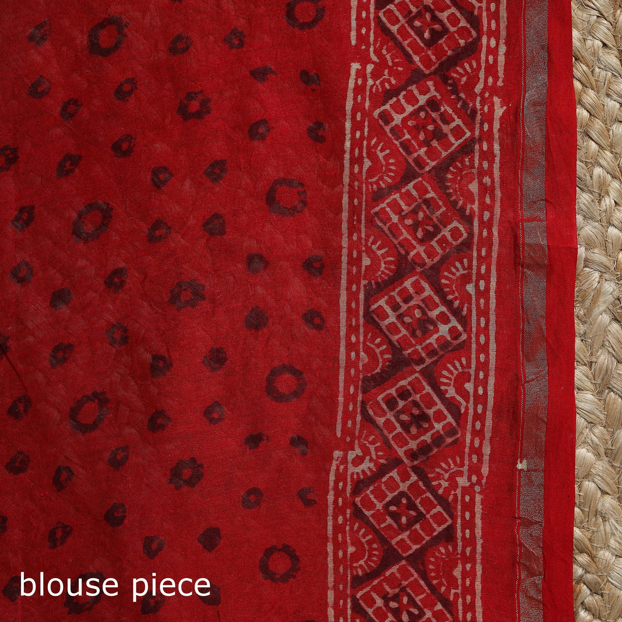 | Material | Red natural dyed hand block print ajrakh saree made from chanderi silk cotton. This textile tradition dates back over 4,500 years and is known for its intricate geometric patterns created through multiple stages of printing and dyeing. The breathable saree is suitable for office wear, cultural events, daytime functions, casual outings and gatherings. |