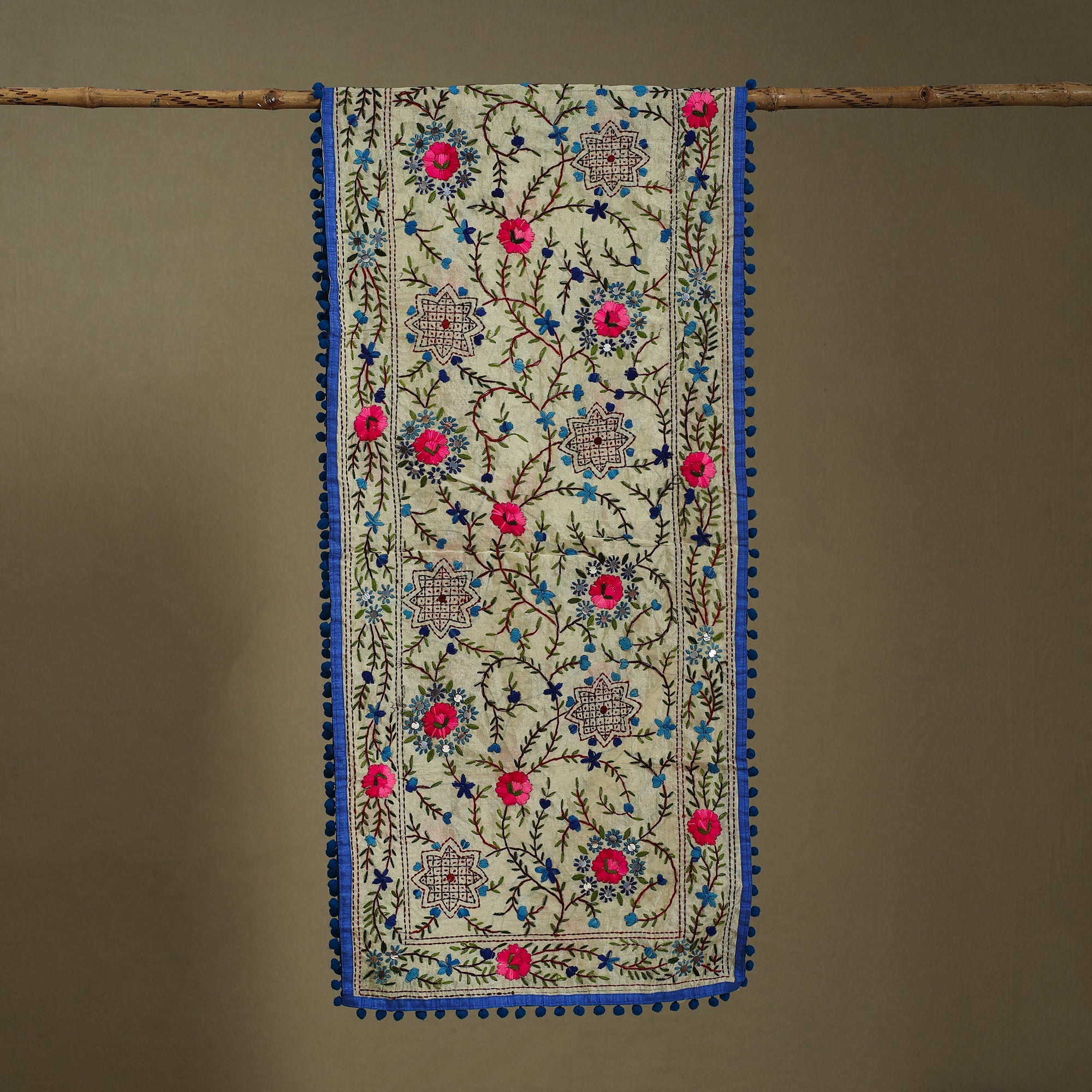| Material | Add charm to your outfit with this blue chapa work hand-embroidered stole in chanderi silk. Featuring pom-poms, Decorated with traditional patterns, the stole is meticulously embroidered by skilled artisans from Ranihati, Howrah, in West Bengal. |