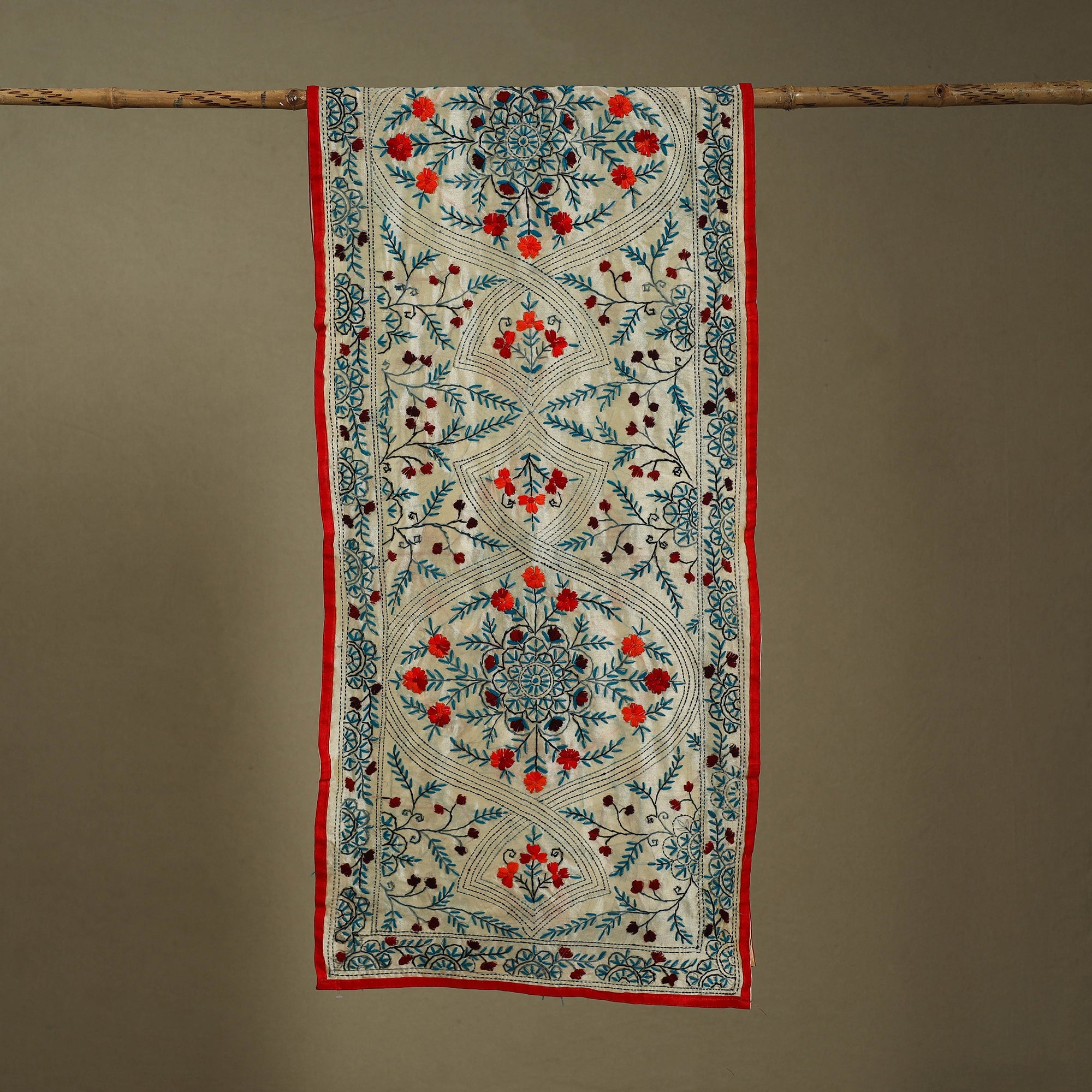 Add charm to your outfit with this red chapa work hand-embroidered stole in chanderi silk. Decorated with traditional patterns, the stole is meticulously embroidered by skilled artisans from Ranihati, Howrah, in West Bengal.