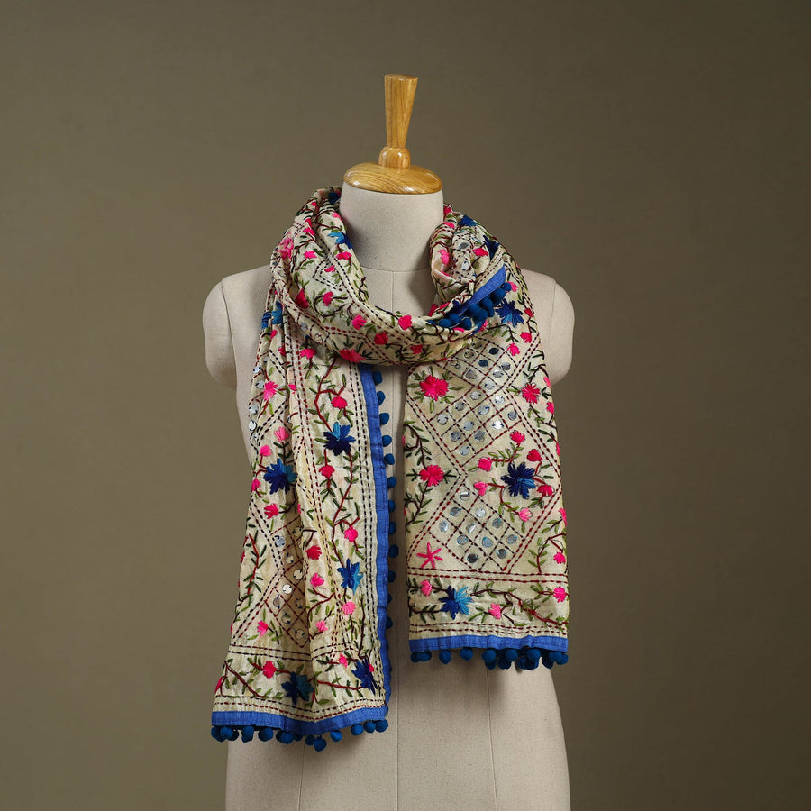 Add charm to your outfit with this blue chapa work hand-embroidered stole in chanderi silk. Featuring pom-poms, Decorated with traditional patterns, the stole is meticulously embroidered by skilled artisans from Ranihati, Howrah, in West Bengal.