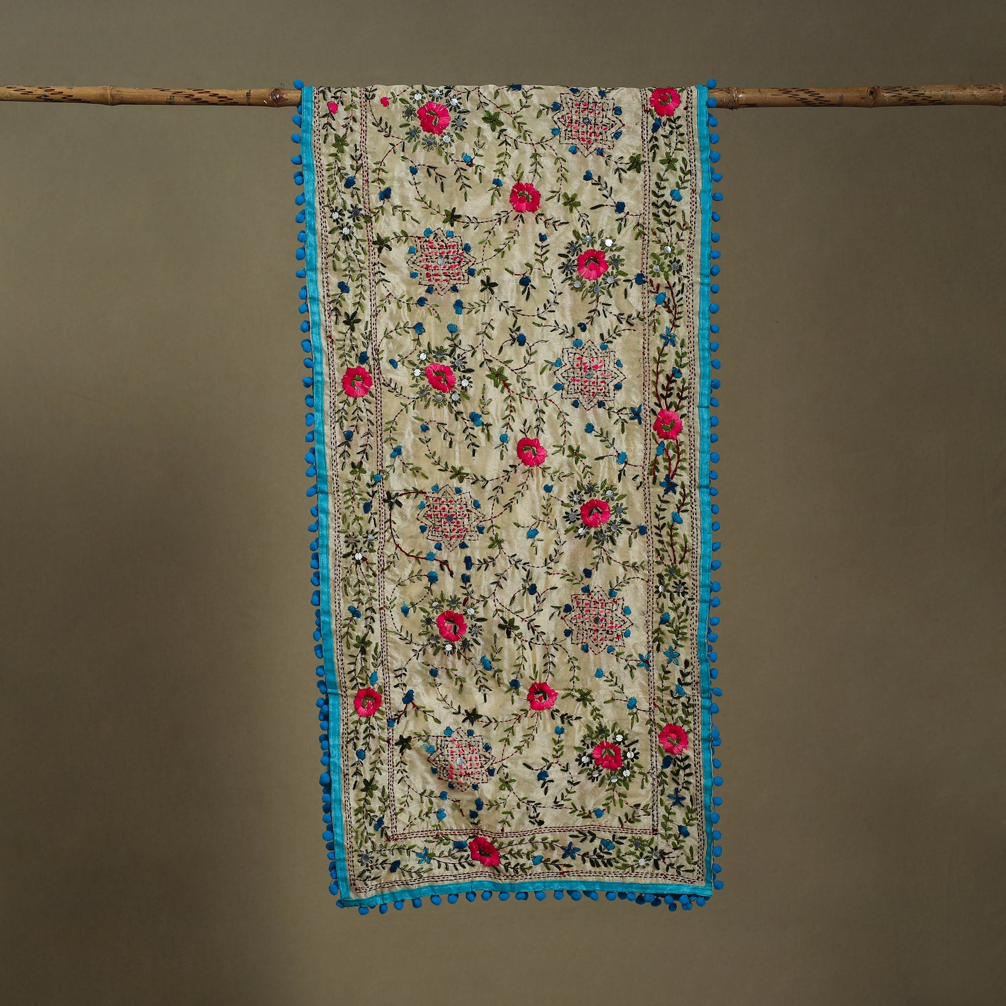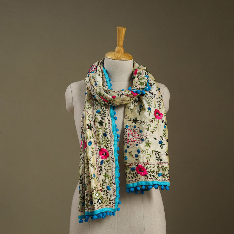 Add charm to your outfit with this blue chapa work hand-embroidered stole in chanderi silk. Featuring pom-poms, Decorated with traditional patterns, the stole is meticulously embroidered by skilled artisans from Ranihati, Howrah, in West Bengal.
