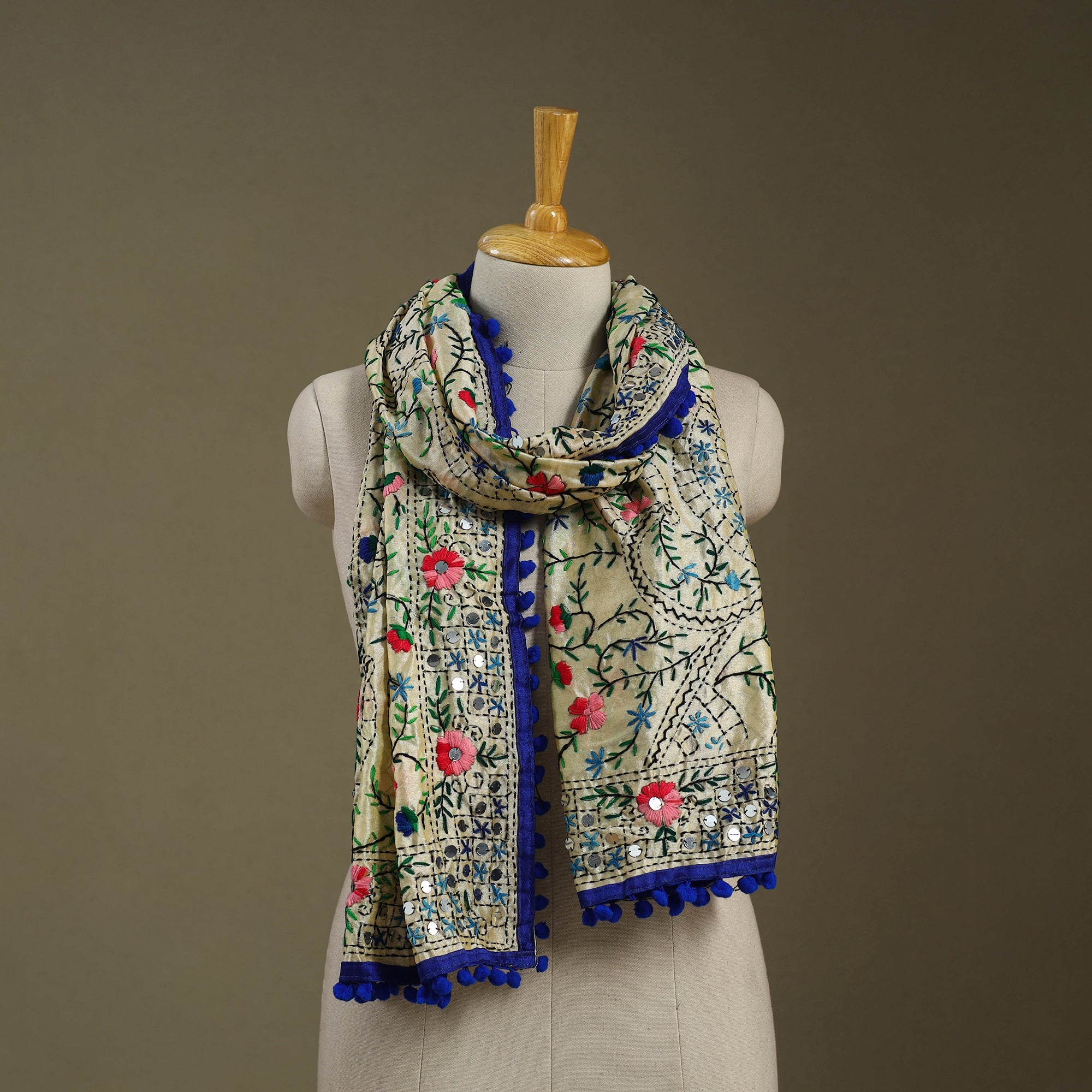 Add charm to your outfit with this blue chapa work hand-embroidered stole in chanderi silk. Featuring pom-poms, Decorated with traditional patterns, the stole is meticulously embroidered by skilled artisans from Ranihati, Howrah, in West Bengal.