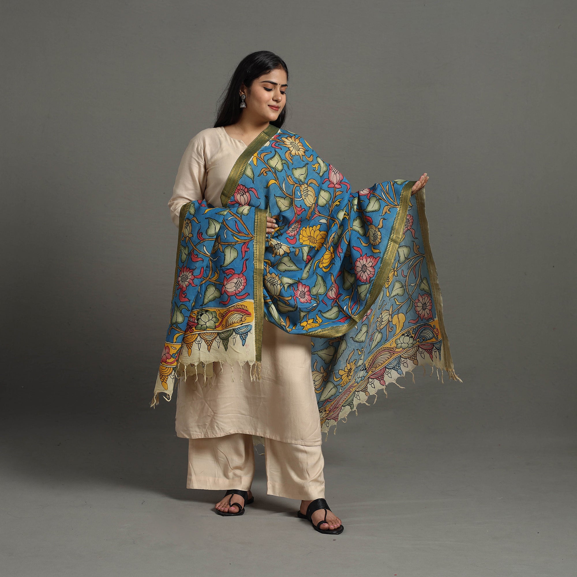 This exquisite blue chanderi silk handloom srikalahasti pen kalamkari dupatta with tassels, is a true testament to India’s rich artisanal heritage. Handpainted using natural colors, the srikalahasti style involves intricate freehand drawing using a pen, passed down through generations of skilled artisans. Each piece is unique, featuring the fine details and craftsmanship of this centuries-old technique.