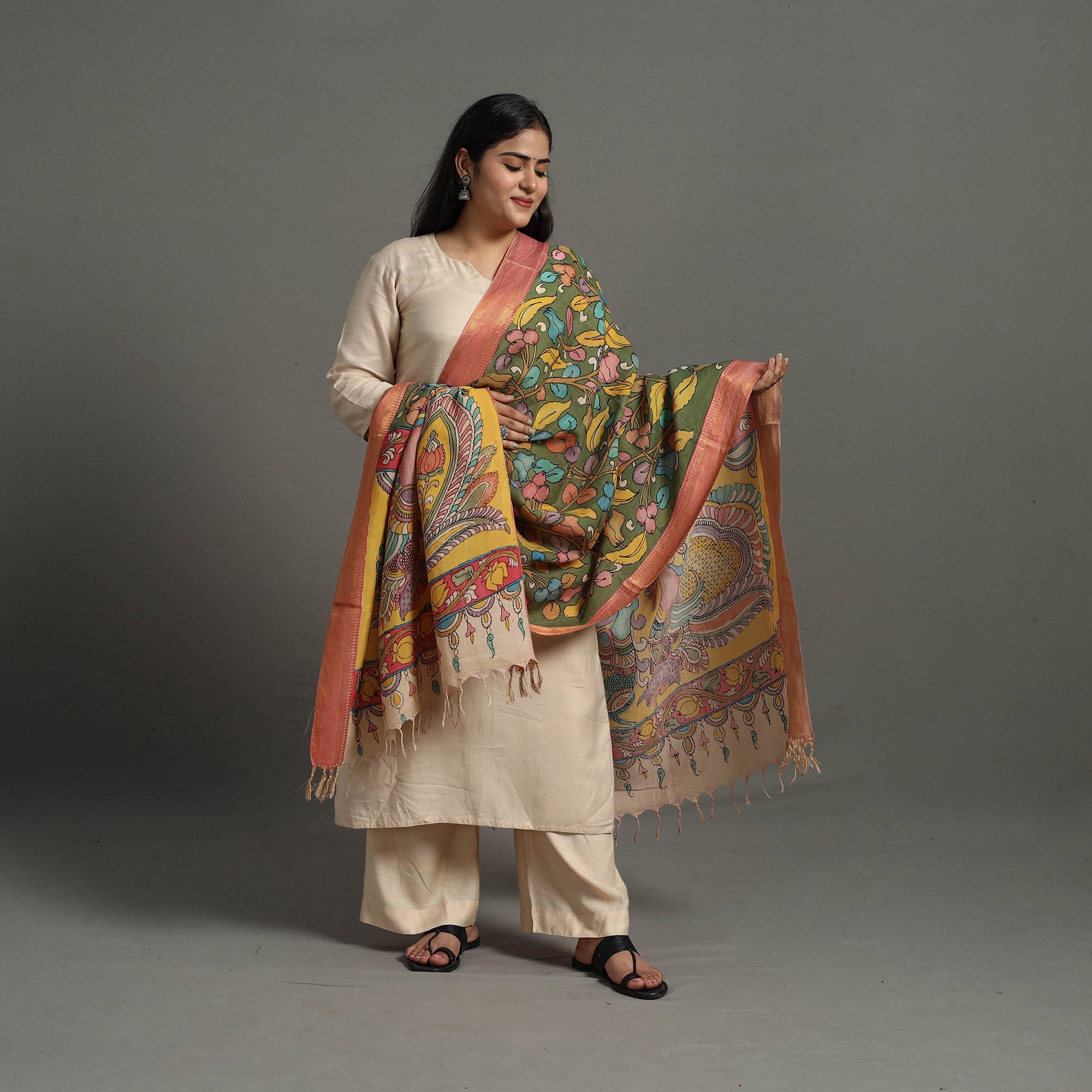 This exquisite green chanderi silk handloom srikalahasti pen kalamkari dupatta with tassels, is a true testament to India’s rich artisanal heritage. Handpainted using natural colors, the srikalahasti style involves intricate freehand drawing using a pen, passed down through generations of skilled artisans. Each piece is unique, featuring the fine details and craftsmanship of this centuries-old technique.