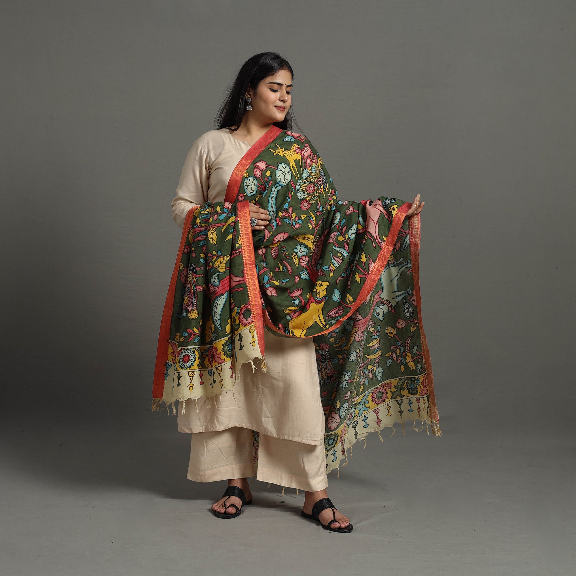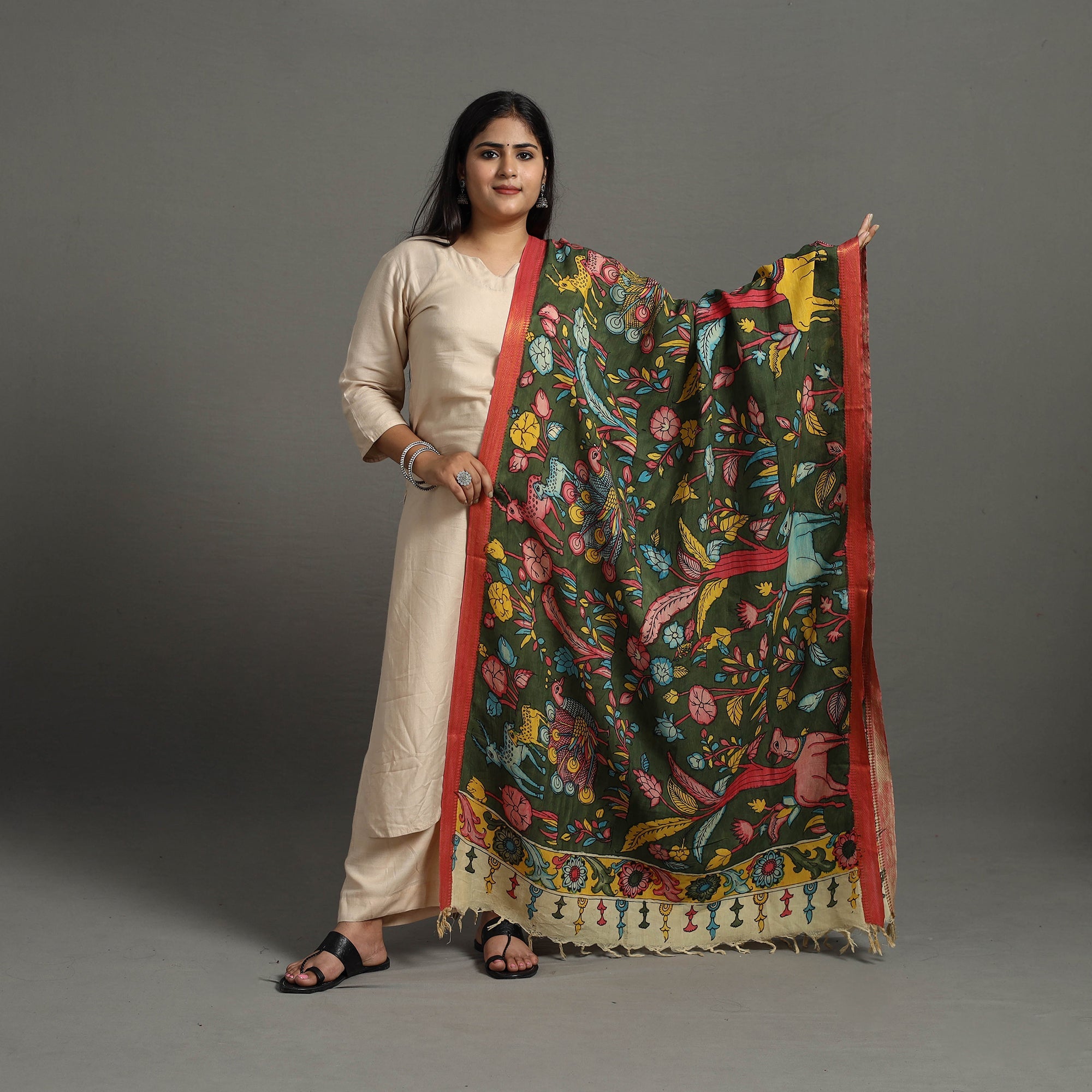 This exquisite green chanderi silk handloom srikalahasti pen kalamkari dupatta with tassels, is a true testament to India’s rich artisanal heritage. Handpainted using natural colors, the srikalahasti style involves intricate freehand drawing using a pen, passed down through generations of skilled artisans. Each piece is unique, featuring the fine details and craftsmanship of this centuries-old technique.