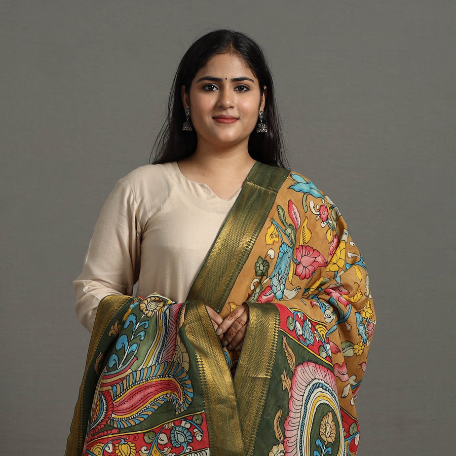 This exquisite brown chanderi silk handloom srikalahasti pen kalamkari dupatta with tassels, is a true testament to India’s rich artisanal heritage. Handpainted using natural colors, the srikalahasti style involves intricate freehand drawing using a pen, passed down through generations of skilled artisans. Each piece is unique, featuring the fine details and craftsmanship of this centuries-old technique.