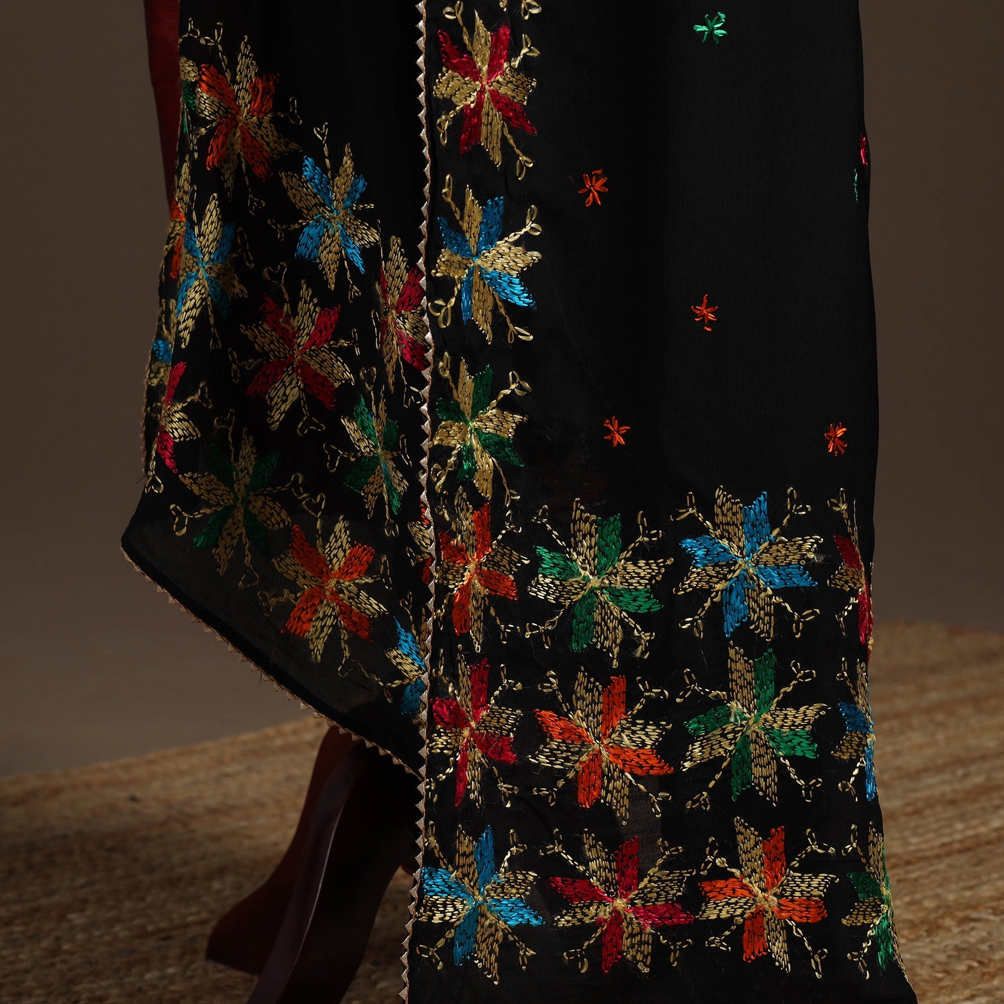 Fine quality black chinon silk hand-embroidered phulkari dupatta. Phulkari is a refined embroidery tradition from the Punjab region. The word phul means flower and kari means craft together, Phulkari represents the art of creating intricate floral and geometric patterns using colorful threads. A unique variation of Phulkari is Bagh work, which literally means "garden" and features embroidery that covers the fabric entirely. Lightweight and graceful, this dupatta is perfect for festive occasions, weddings and cultural celebrations.