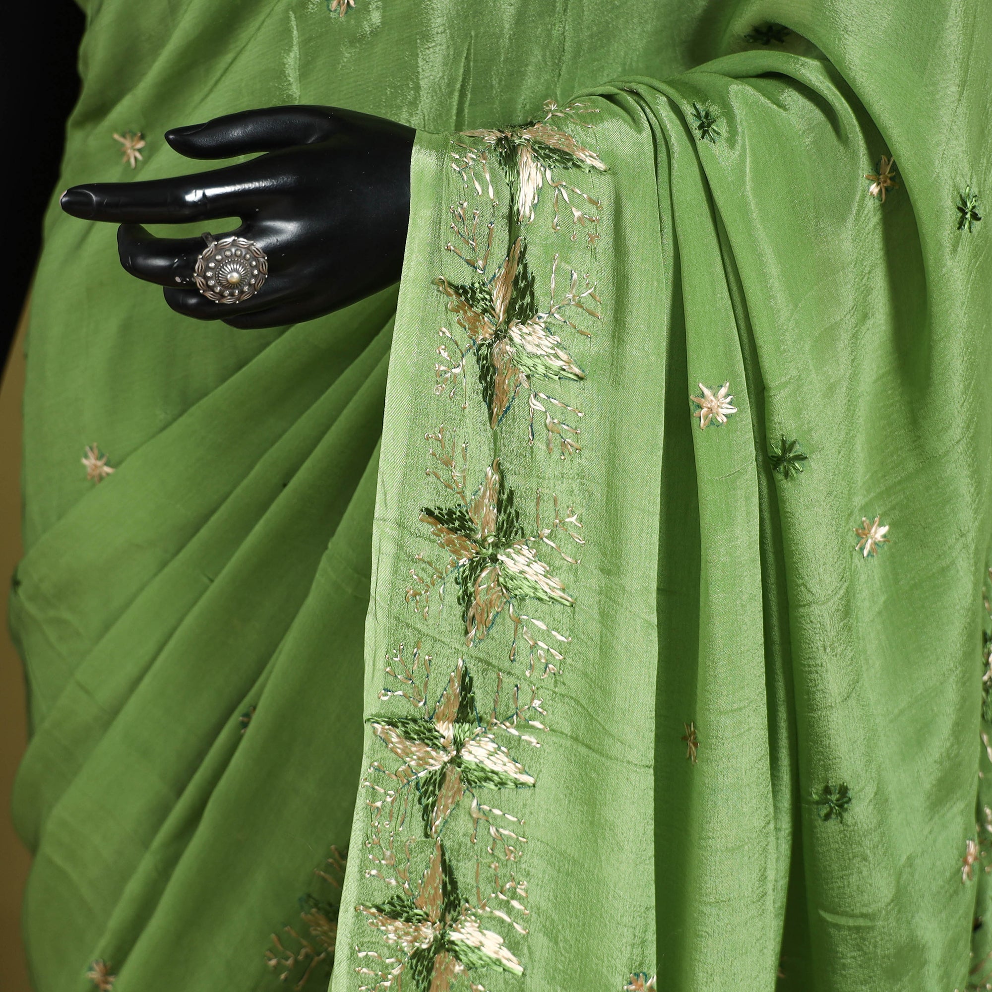 Fine quality green chinon silk hand-embroidered phulkari saree. Phulkari is a refined embroidery tradition from the Punjab region. The word phul means flower, and kari means craft together, Phulkari represents the art of creating intricate floral and geometric patterns using colorful threads. A unique variation of Phulkari is Bagh work, which literally means "garden" and features embroidery that covers the fabric entirely. Lightweight and graceful, this saree is perfect for festive occasions, weddings, and cultural celebrations.