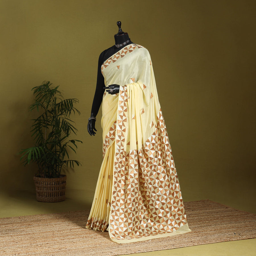 Fine quality yellow chinon silk hand-embroidered phulkari saree. Phulkari is a refined embroidery tradition from the Punjab region. The word phul means flower, and kari means craft together, Phulkari represents the art of creating intricate floral and geometric patterns using colorful threads. A unique variation of Phulkari is Bagh work, which literally means "garden" and features embroidery that covers the fabric entirely. Lightweight and graceful, this saree is perfect for festive occasions, weddings, and cultural celebrations.