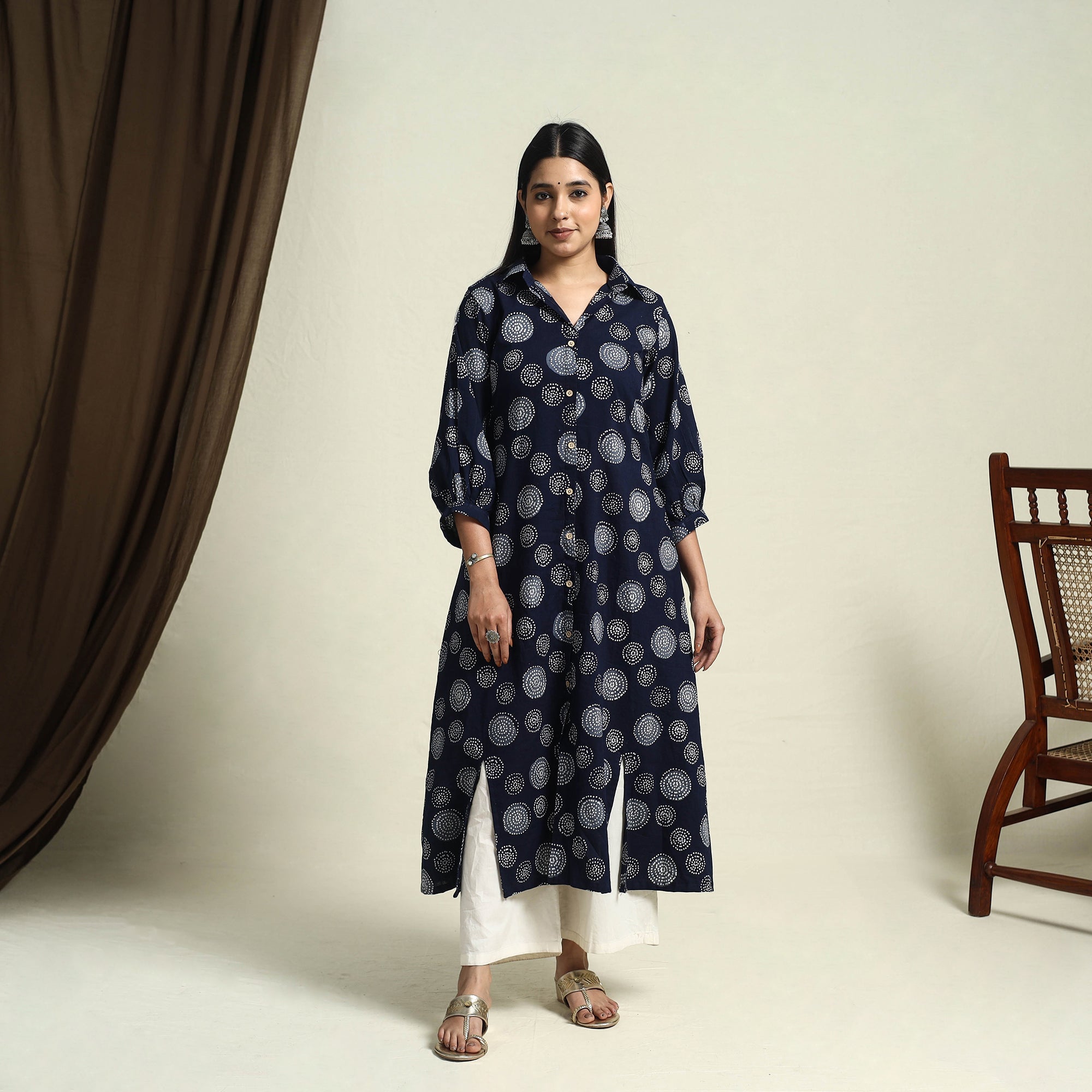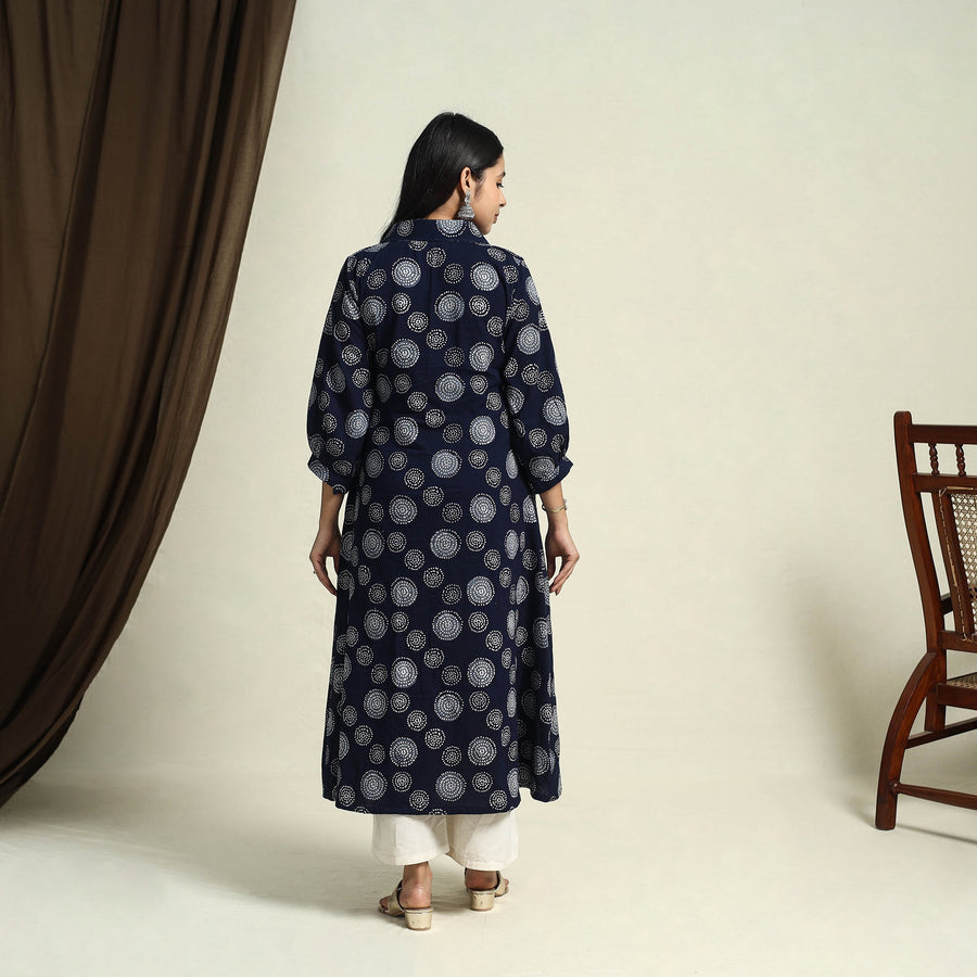 Step into the elegance with this cotton blue kurta adorned in timeless batik prints. The resist dye method lends each piece its own character, while the crisp collar and button-down front add a touch of structure. Designed in breathable cotton with a handy pocket on one side, this kurta blends comfort and charm perfect for workdays, brunches, or laid-back evenings.