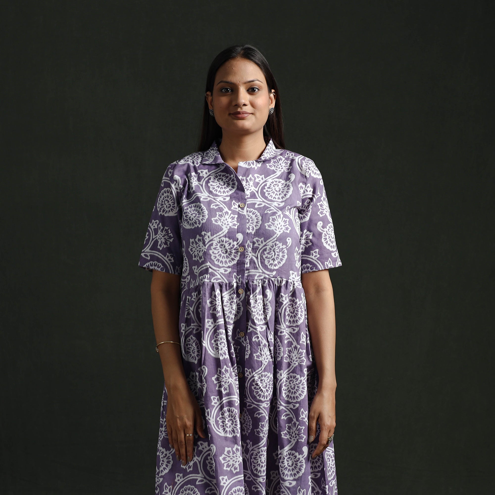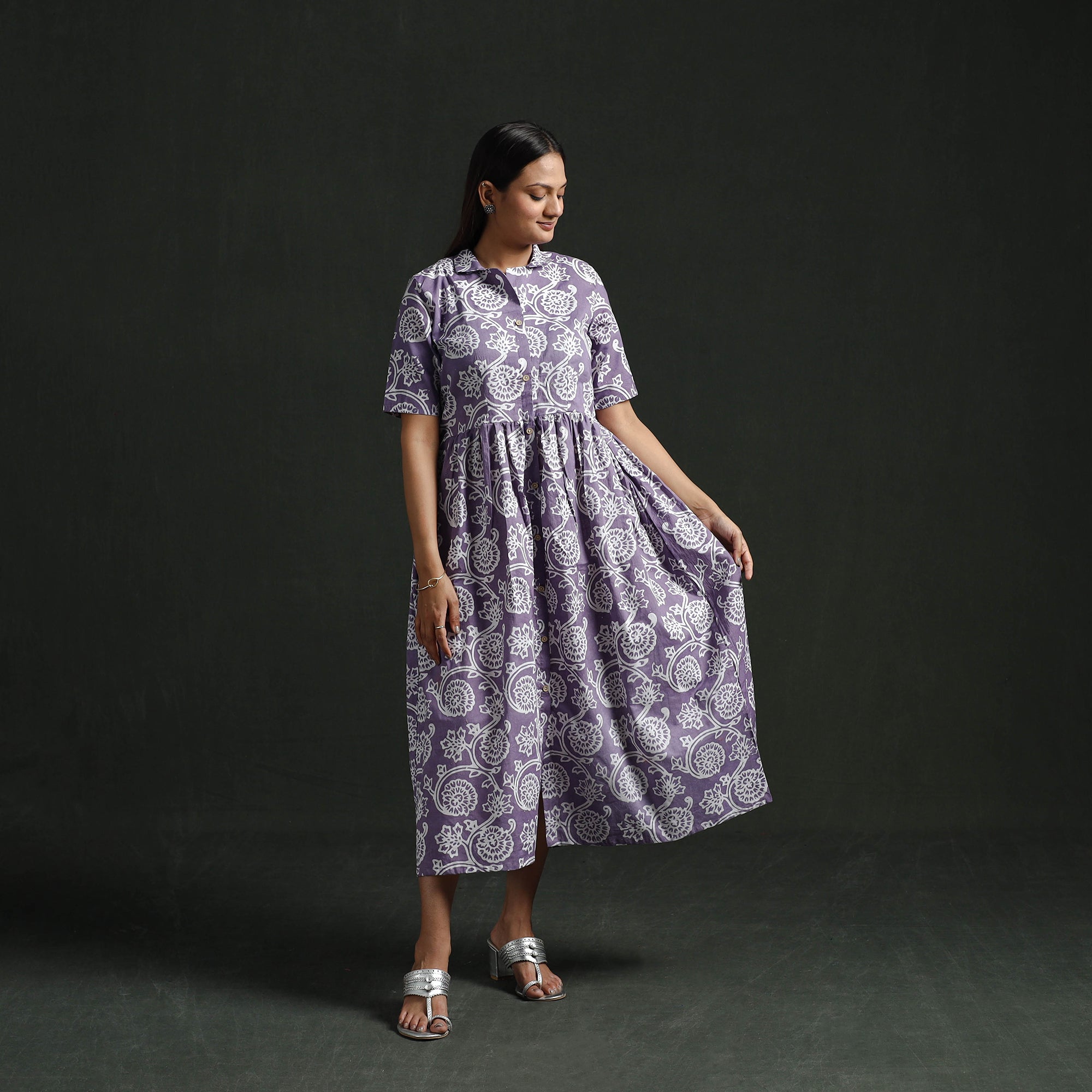 Collared neck button-down flared dress is designed in a traditional batik block print created using the wax-resist dyeing technique. In this method, hot wax is applied in patterns on the fabric before dyeing to form distinctive motifs. Batik has been practiced in India for centuries and is known for its detailed and expressive designs. Made from cotton, the dress remains comfortable for extended wear. The flared silhouette adds graceful movement and enhances its overall look. Suitable for daily wear, casual outings, or relaxed gatherings, this dress offers a balanced combination of functionality and style.