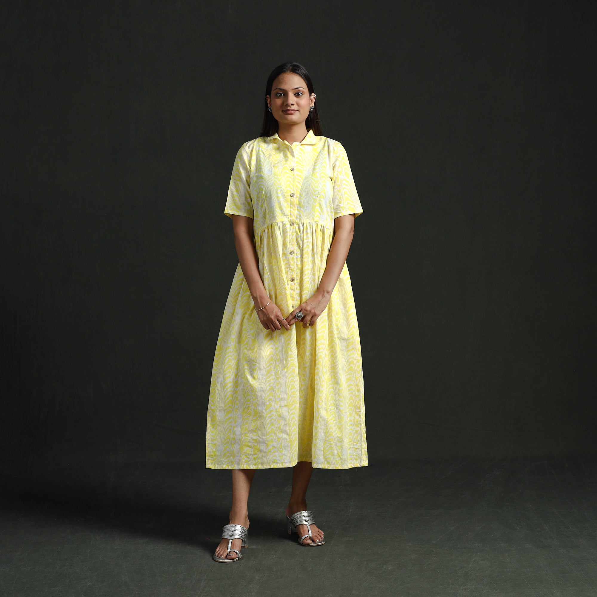 | Material | Collared neck button-down flared dress is designed in a traditional batik block print created using the wax-resist dyeing technique. In this method, hot wax is applied in patterns on the fabric before dyeing to form distinctive motifs. Batik has been practiced in India for centuries and is known for its detailed and expressive designs. Made from cotton, the dress remains comfortable for extended wear. The flared silhouette adds graceful movement and enhances its overall look. Suitable for daily wear, casual outings, or relaxed gatherings, this dress offers a balanced combination of functionality and style. |