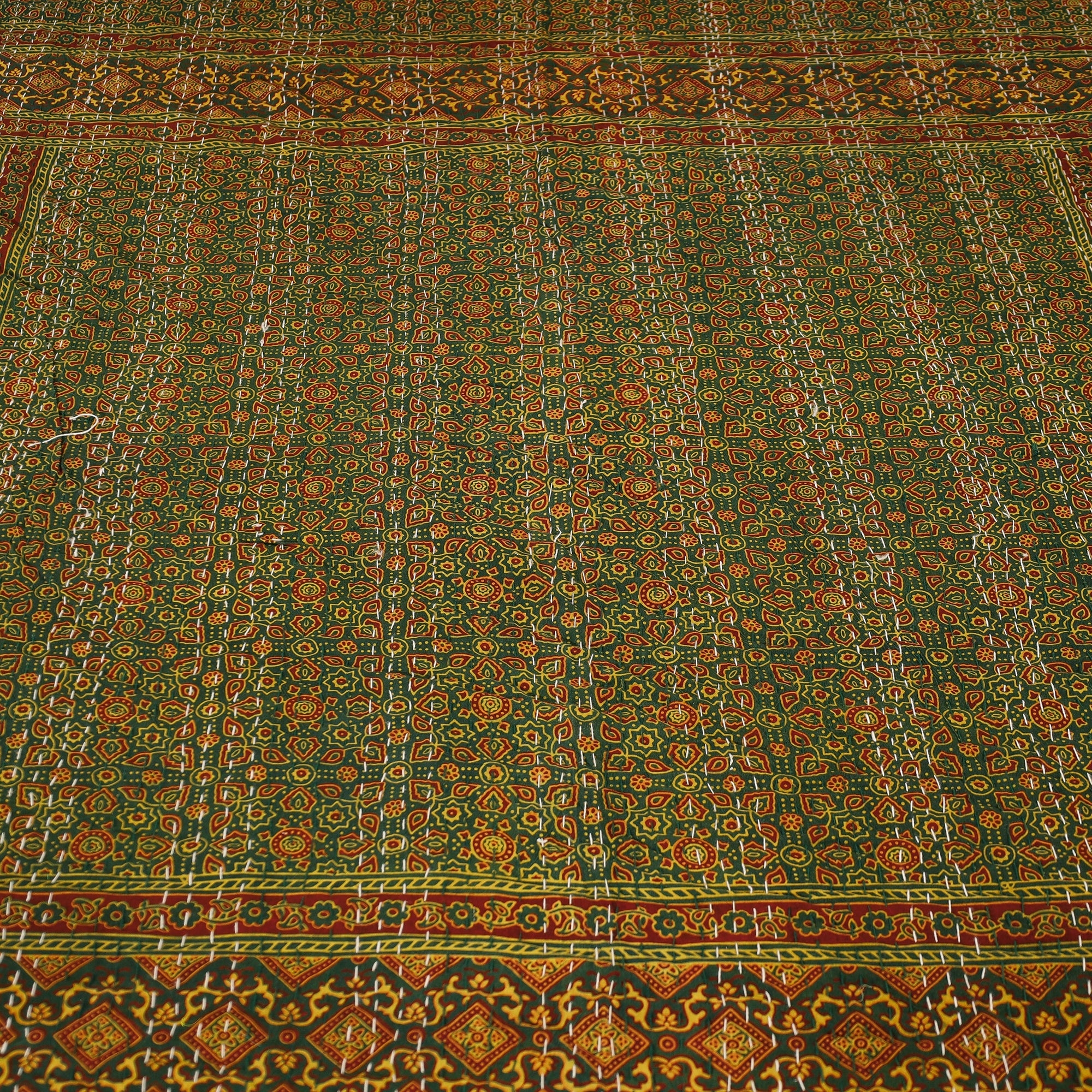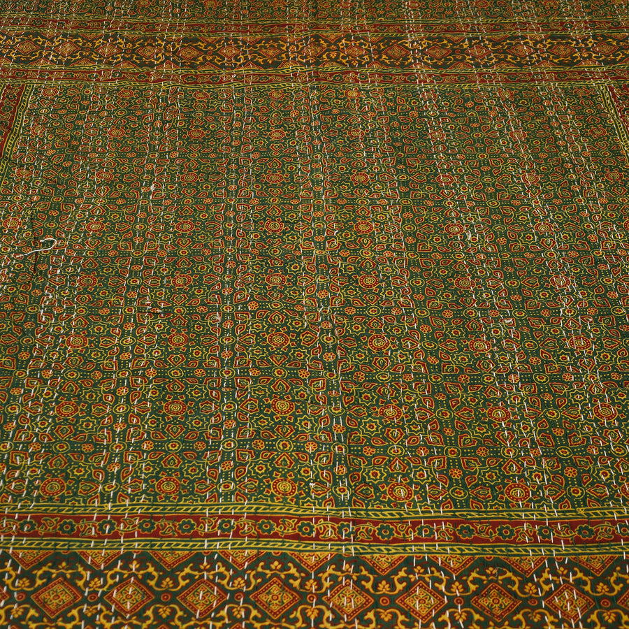 Fine quality ajrakh block printing double bedcover with kantha embroidery made using natural dyes through traditional process of hand block printing practised by the master artisans in Barmer, Rajasthan.