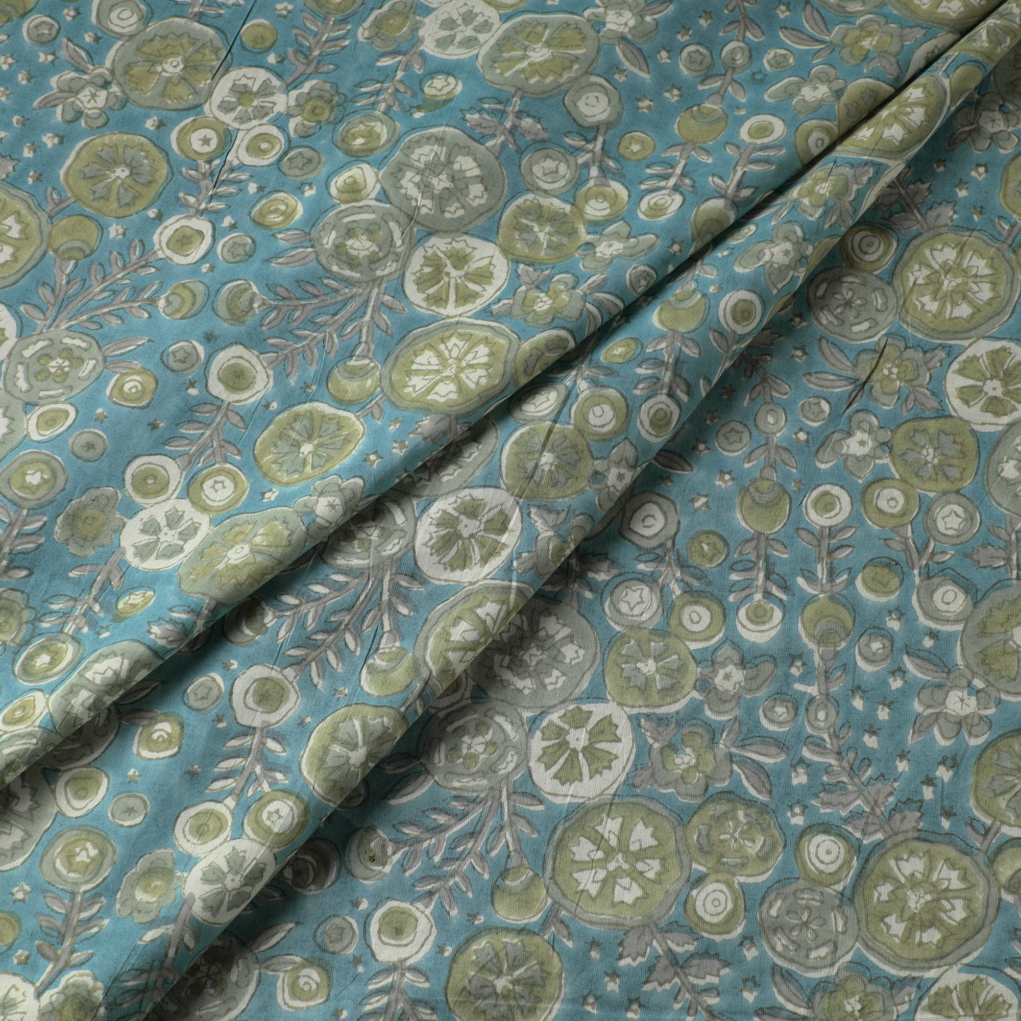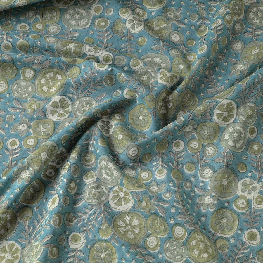 Fine quality faded greenish florals sanganeri hand block printed pure cotton fabric. sanganeri is a hand-block printed technique originating from sanganer, a village in the southern part of Jaipur, Rajasthan. Bleed free vat dyes used.