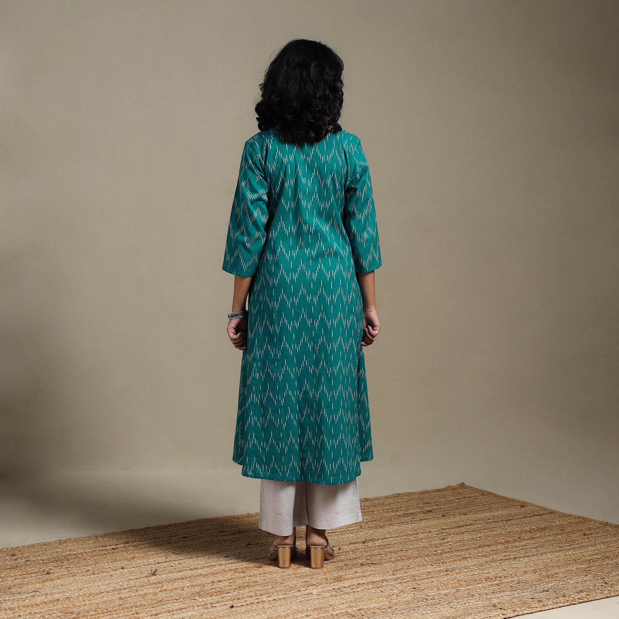 This green cotton pochampally ikat a-line kurta is crafted using the resist-dye technique, where the yarns are dyed before weaving to create intricate patterns. Designed with a practical side pocket, it offers both comfort and versatility, making it ideal for office wear, casual outings, or weekend gatherings.