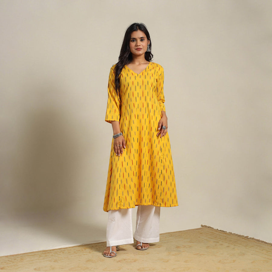 This yellow cotton A-line pochampally Ikat kurta is crafted using the age-old resist-dye technique. The intricate patterns are created by dyeing the yarns before weaving, resulting in a rich, woven design. Thoughtfully designed with a handy side pocket perfect for keeping small essentials, it’s ideal for workdays, casual brunches, relaxed weekends, or even light festive gatherings.