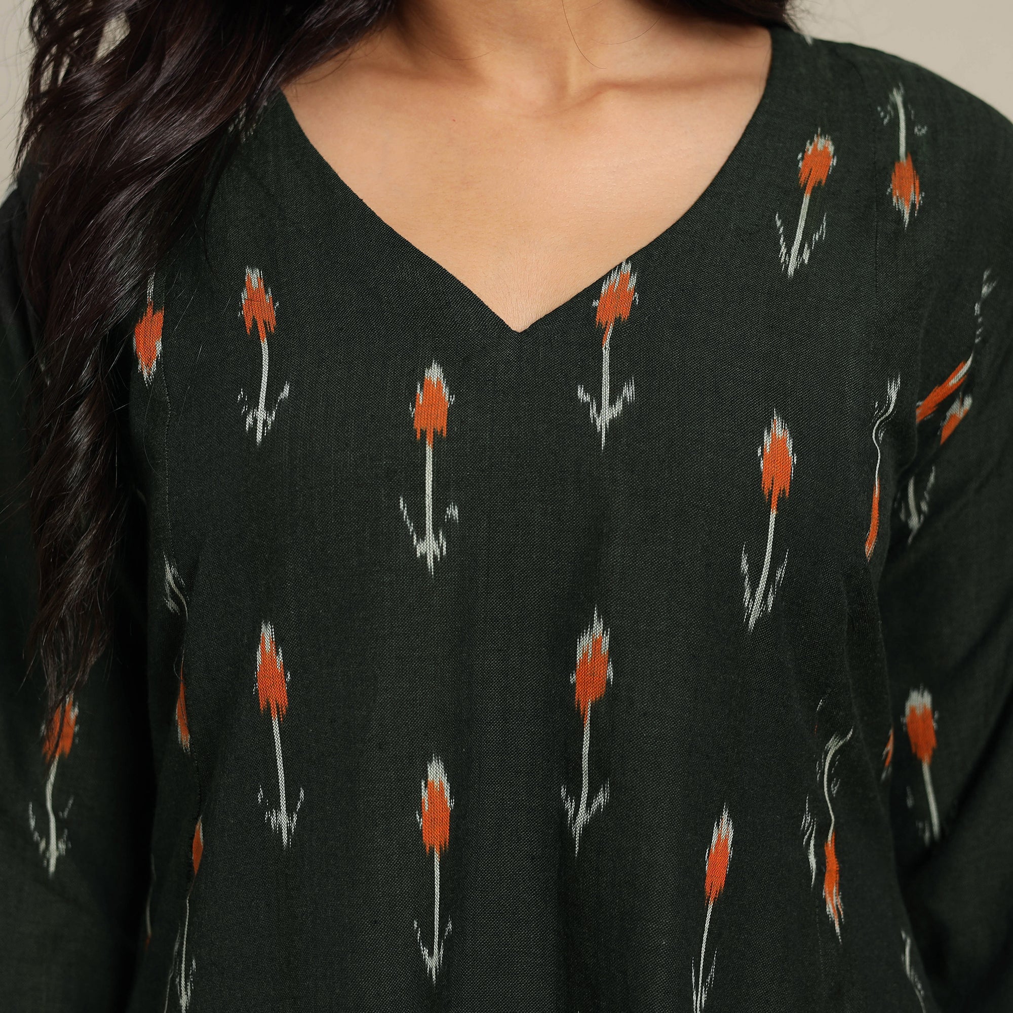 This black cotton A-line pochampally Ikat kurta is crafted using the age-old resist-dye technique. The intricate patterns are created by dyeing the yarns before weaving, resulting in a rich, woven design. Thoughtfully designed with a handy side pocket perfect for keeping small essentials, it’s ideal for workdays, casual brunches, relaxed weekends, or even light festive gatherings.