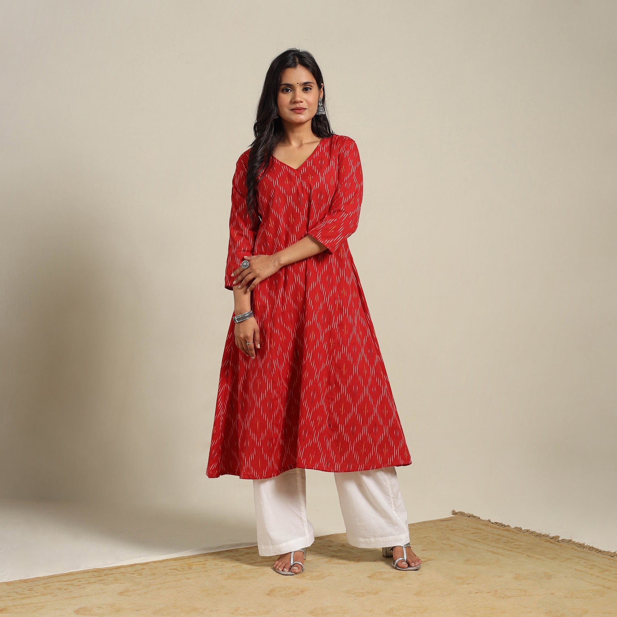 This red cotton A-line pochampally Ikat kurta is crafted using the age-old resist-dye technique. The intricate patterns are created by dyeing the yarns before weaving, resulting in a rich, woven design. Thoughtfully designed with a handy side pocket perfect for keeping small essentials, it’s ideal for workdays, casual brunches, relaxed weekends, or even light festive gatherings.