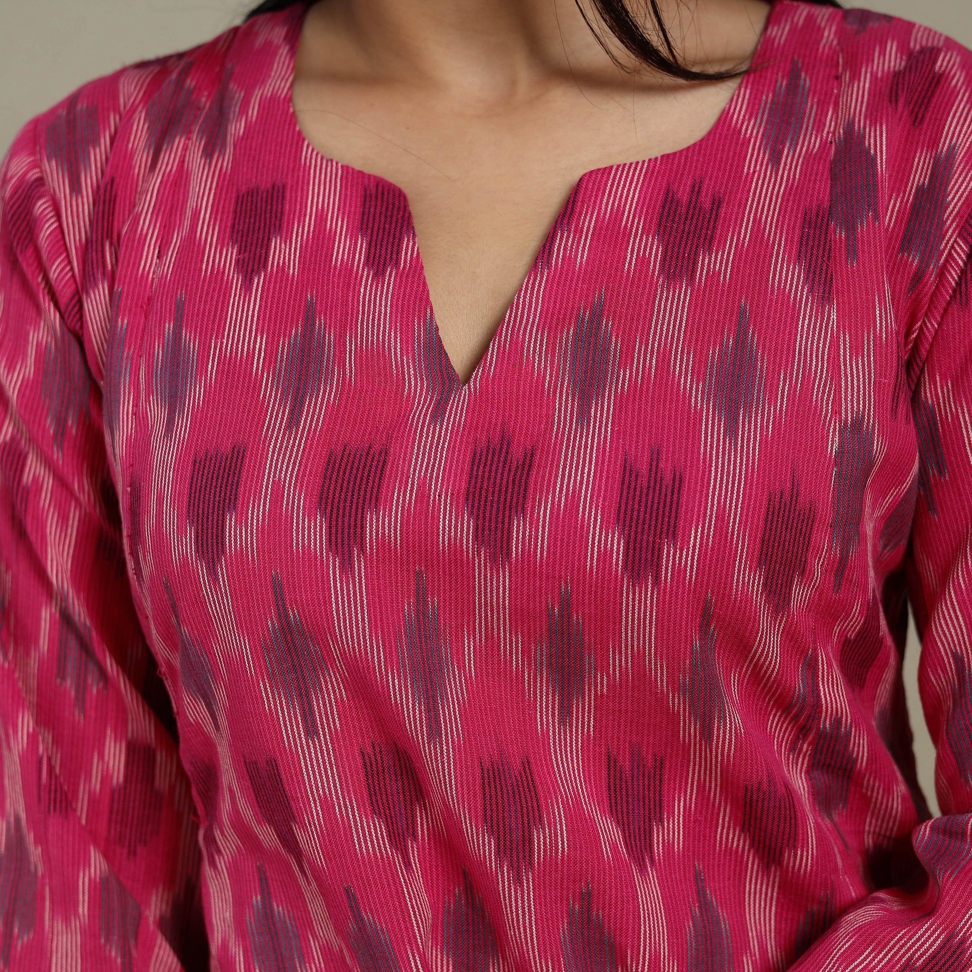 This pink cotton pochampally Ikat A-line Kurta is crafted using the resist-dye technique, where yarns are dyed before weaving to form intricate patterns. Designed with a practical side pocket, it is both comfortable and adaptable for everyday use. Ideal for office wear, casual outings, or weekend gatherings, it balances daily ease with a touch of cultural elegance.