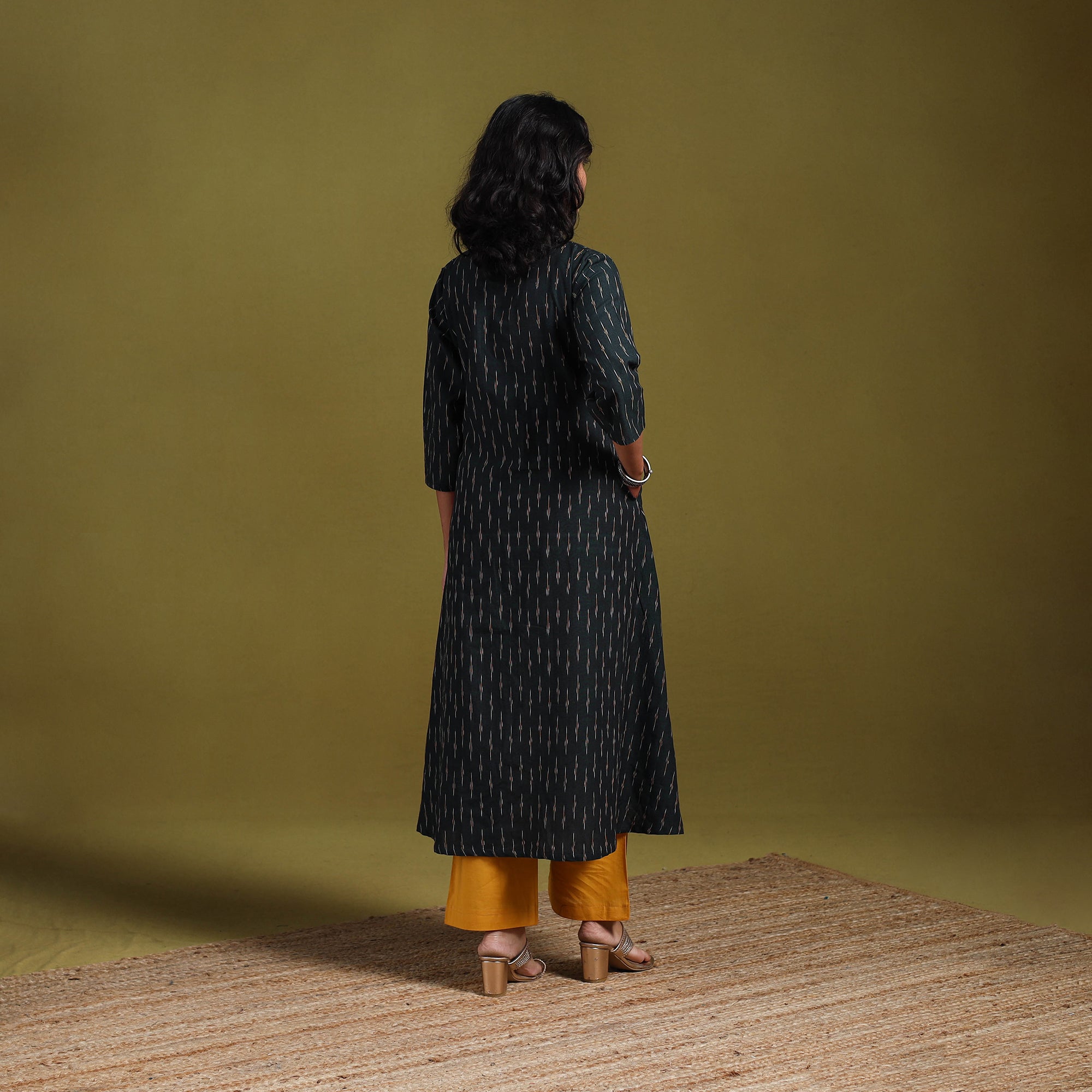 Pure cotton a-line pochampally ikat weave kurta is made using a resist-dye process in which the yarns are dyed before weaving, resulting in detailed geometric patterns. The kurta includes a useful side pocket and offers an easy, relaxed fit, making it suitable for office wear, casual outings and weekend plans.