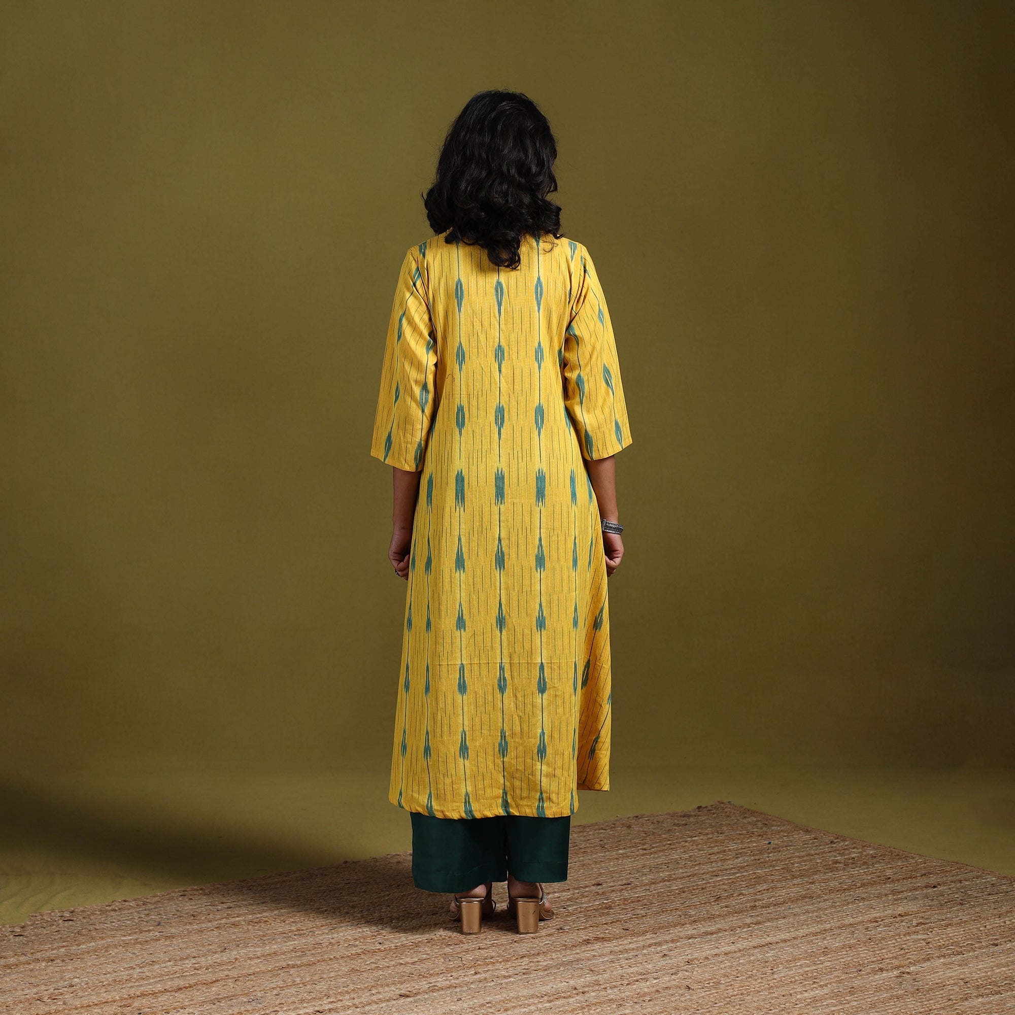 Pure cotton a-line pochampally ikat weave kurta is made using a resist-dye process in which the yarns are dyed before weaving, resulting in detailed geometric patterns. The kurta includes a useful side pocket and offers an easy, relaxed fit, making it suitable for office wear, casual outings and weekend plans.
