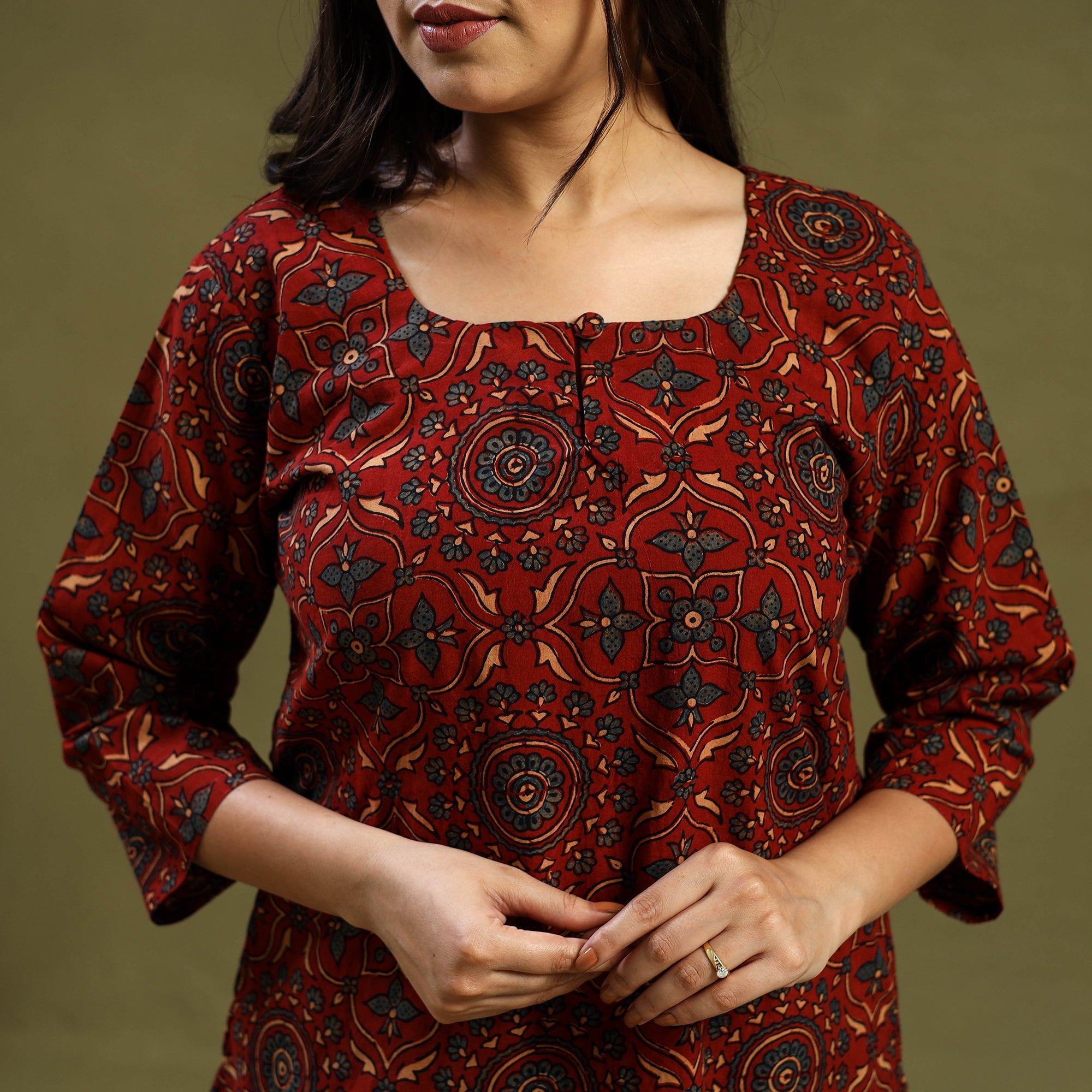 This red ajrakh block-printed night suit set crafted from naturally dyed cotton, offers breathable comfort with artisanal elegance. Showcasing traditional ajrakh motifs, it features a relaxed-fit top and matching pyjamas with an elasticated waist and two side pockets. The hand block printing represents a centuries-old textile tradition from Kutch, Gujarat. Thoughtfully crafted for relaxed evenings and restful nights, it brings tradition into your routine with style.