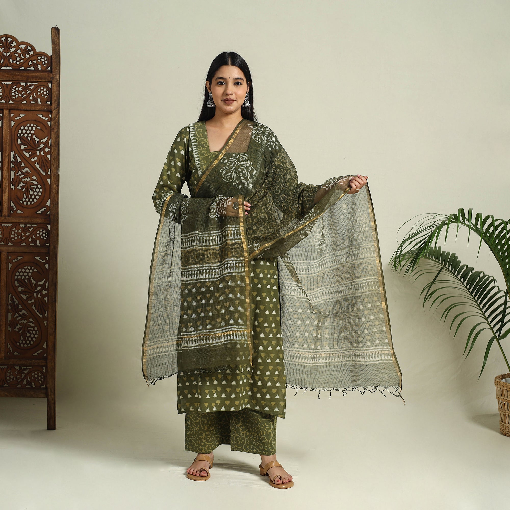 Celebrate the beauty of traditional craftsmanship with this cotton green batik print kurta set. Batik printing, known for its intricate wax-resist dyeing technique, adds a unique charm to the ensemble. The set features a comfortable kurta with a side pocket, a matching elasticated waist palazzo with two side pockets, and a kota doria cotton dupatta. Ideal for festive gatherings or casual outings, it beautifully blends artistry with everyday comfort.