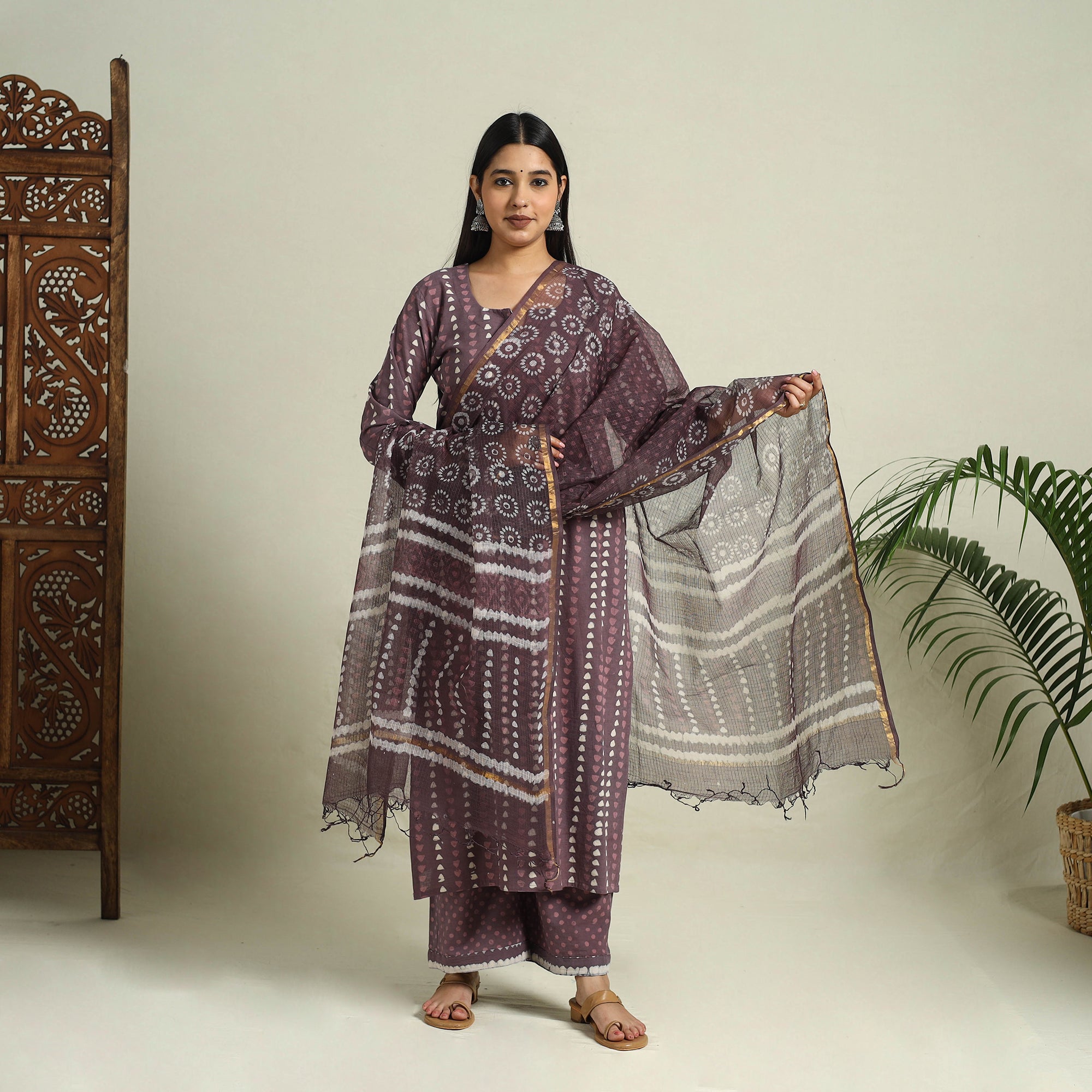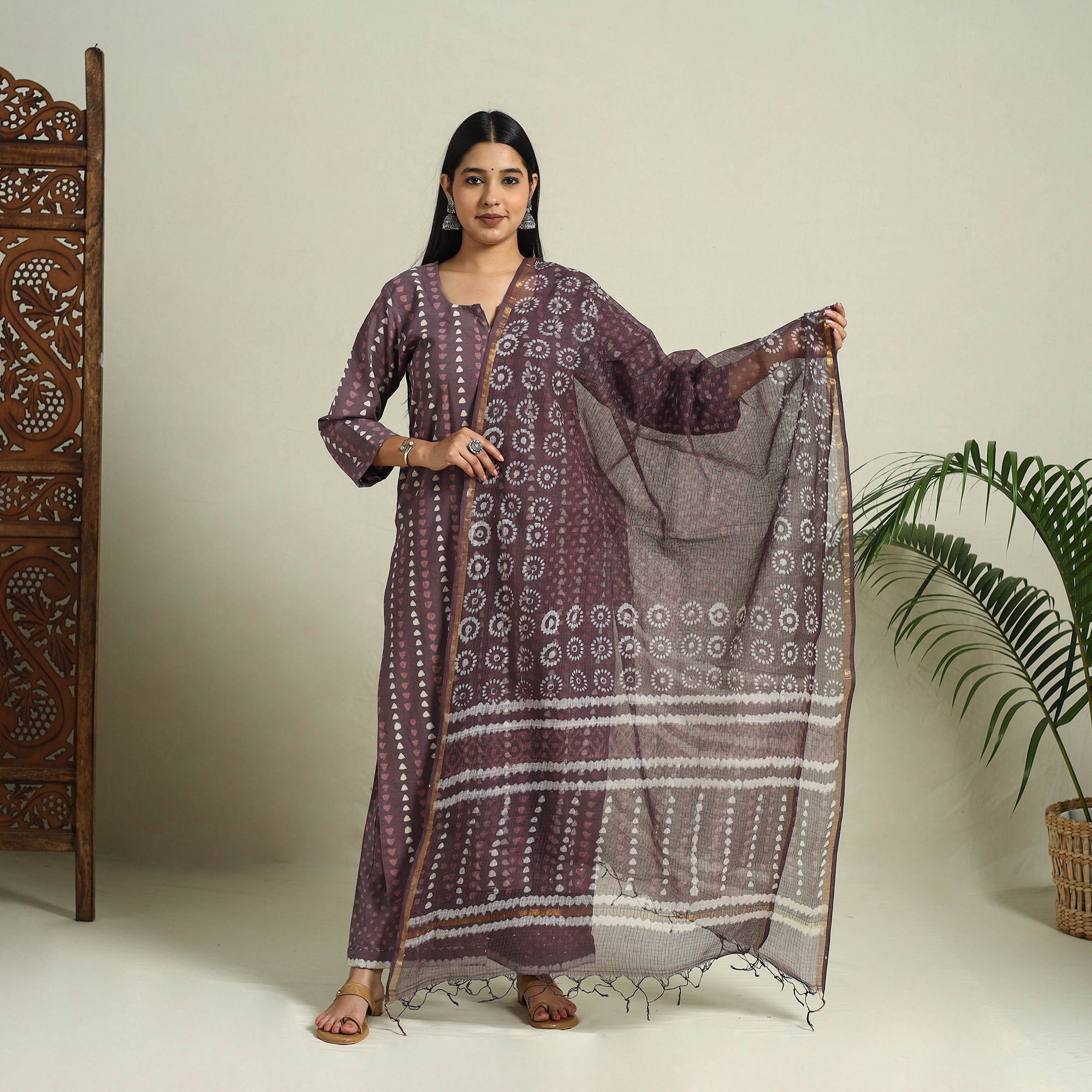 Celebrate the beauty of traditional craftsmanship with this cotton purple batik print kurta set. Batik printing, known for its intricate wax-resist dyeing technique, adds a unique charm to the ensemble. The set features a comfortable kurta with a side pocket, a matching elasticated waist palazzo with two side pockets, and a kota doria cotton dupatta. Ideal for festive gatherings or casual outings, it beautifully blends artistry with everyday comfort.