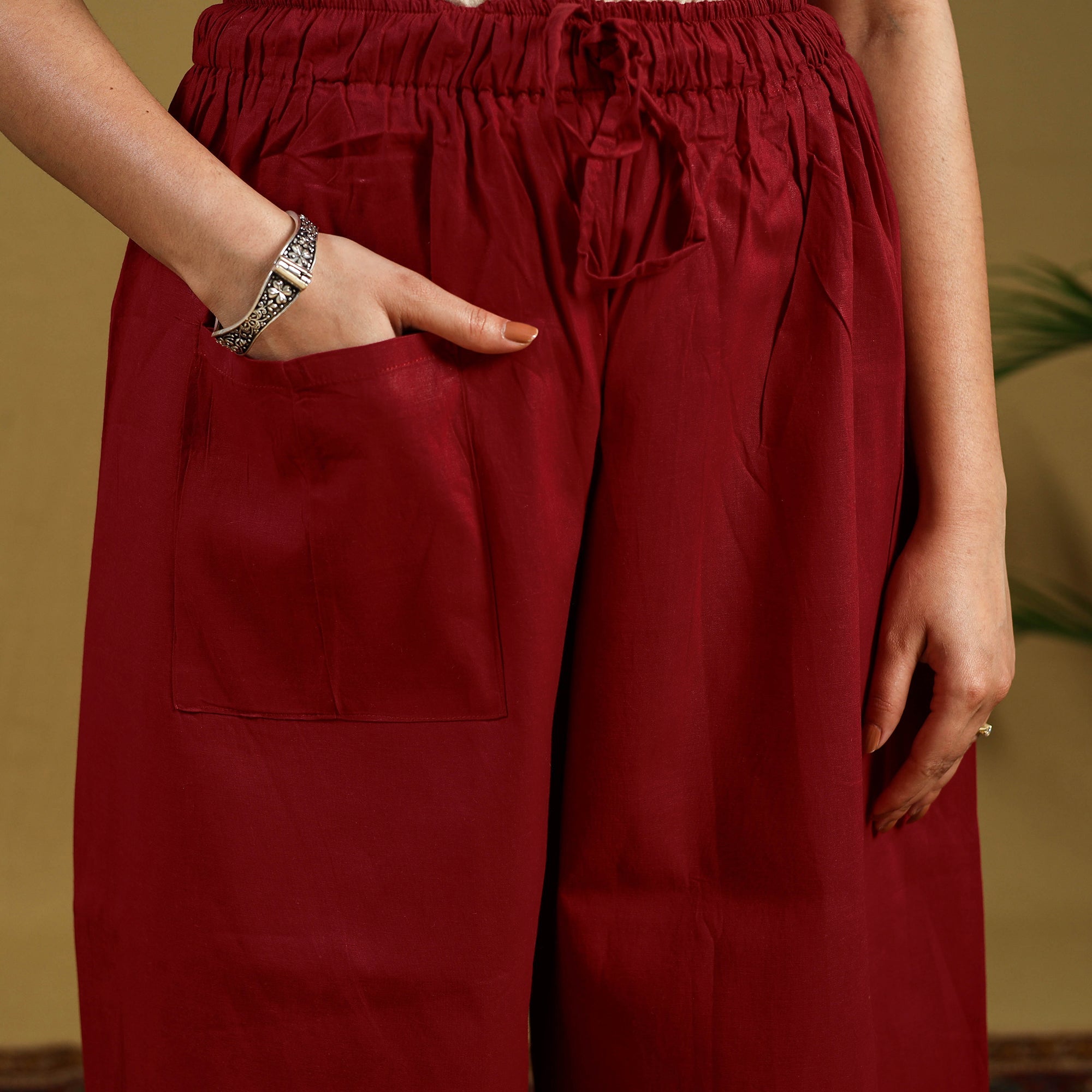 Infuse tradition into your wardrobe with this red cotton palazzo featuring kantha embroidery from Bengal. The delicate hand-stitching on lightweight cotton creates a beautiful fusion of comfort and artistry. Its roomy wide-leg cut ensures day-long ease, ideal for relaxed outings, friendly gatherings, or weekend vibes.