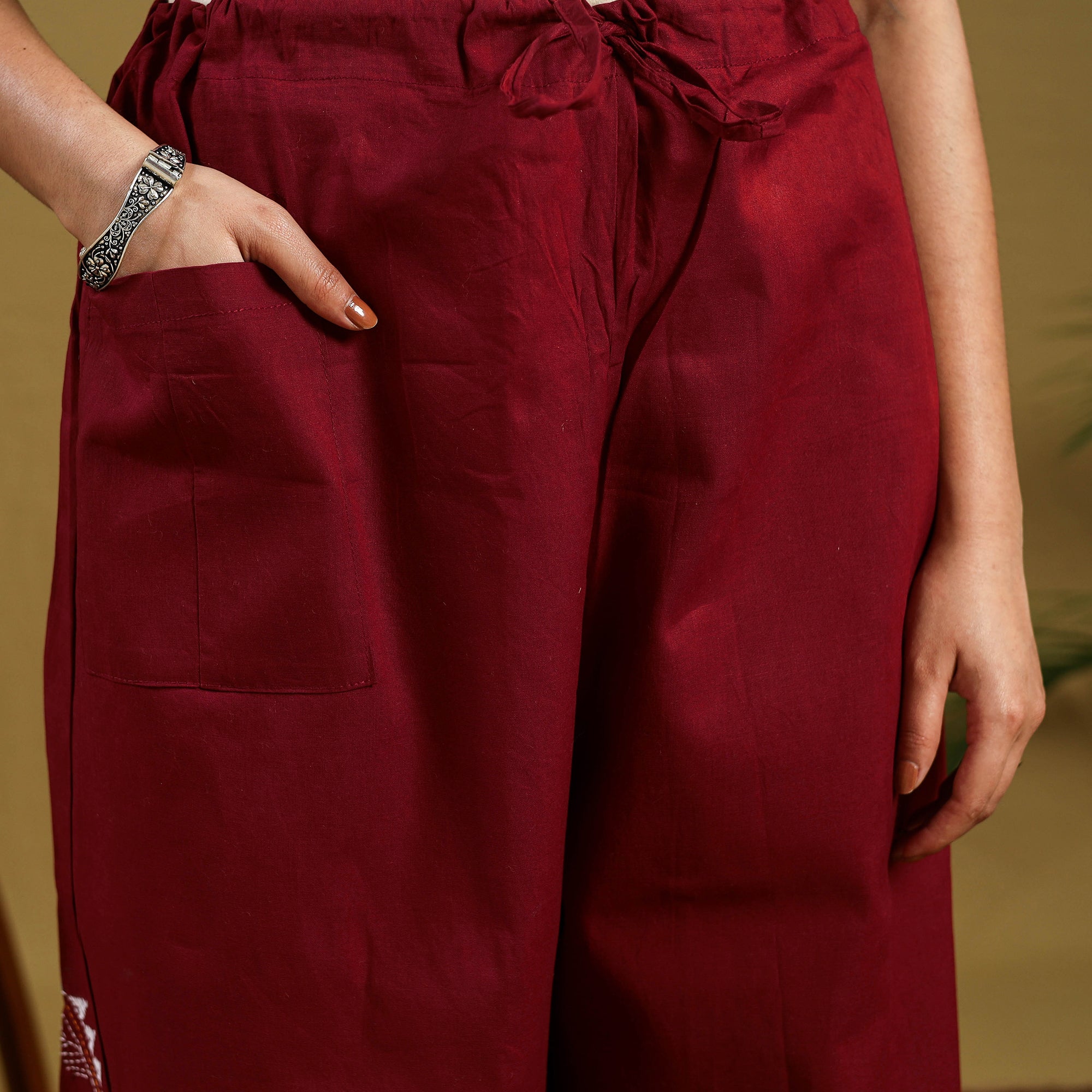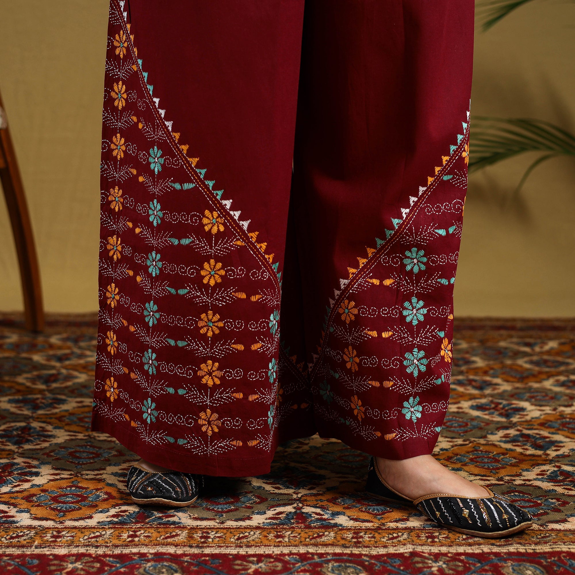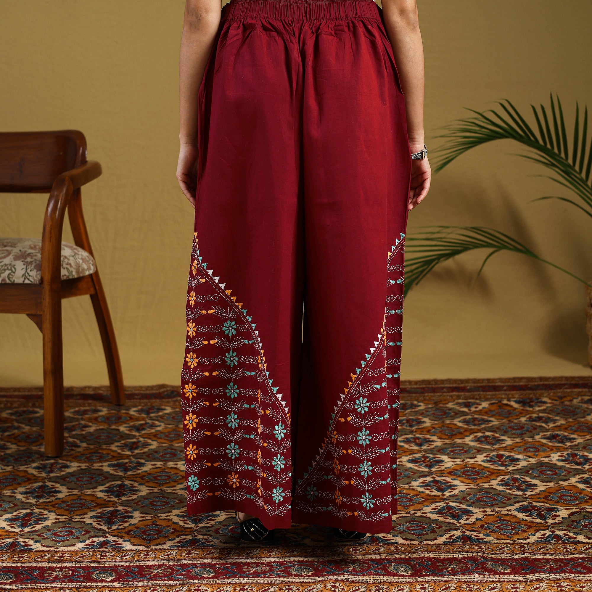 Infuse tradition into your wardrobe with this red cotton palazzo featuring kantha embroidery from Bengal. The delicate hand-stitching on lightweight cotton creates a beautiful fusion of comfort and artistry. Its roomy wide-leg cut ensures day-long ease, ideal for relaxed outings, friendly gatherings, or weekend vibes.