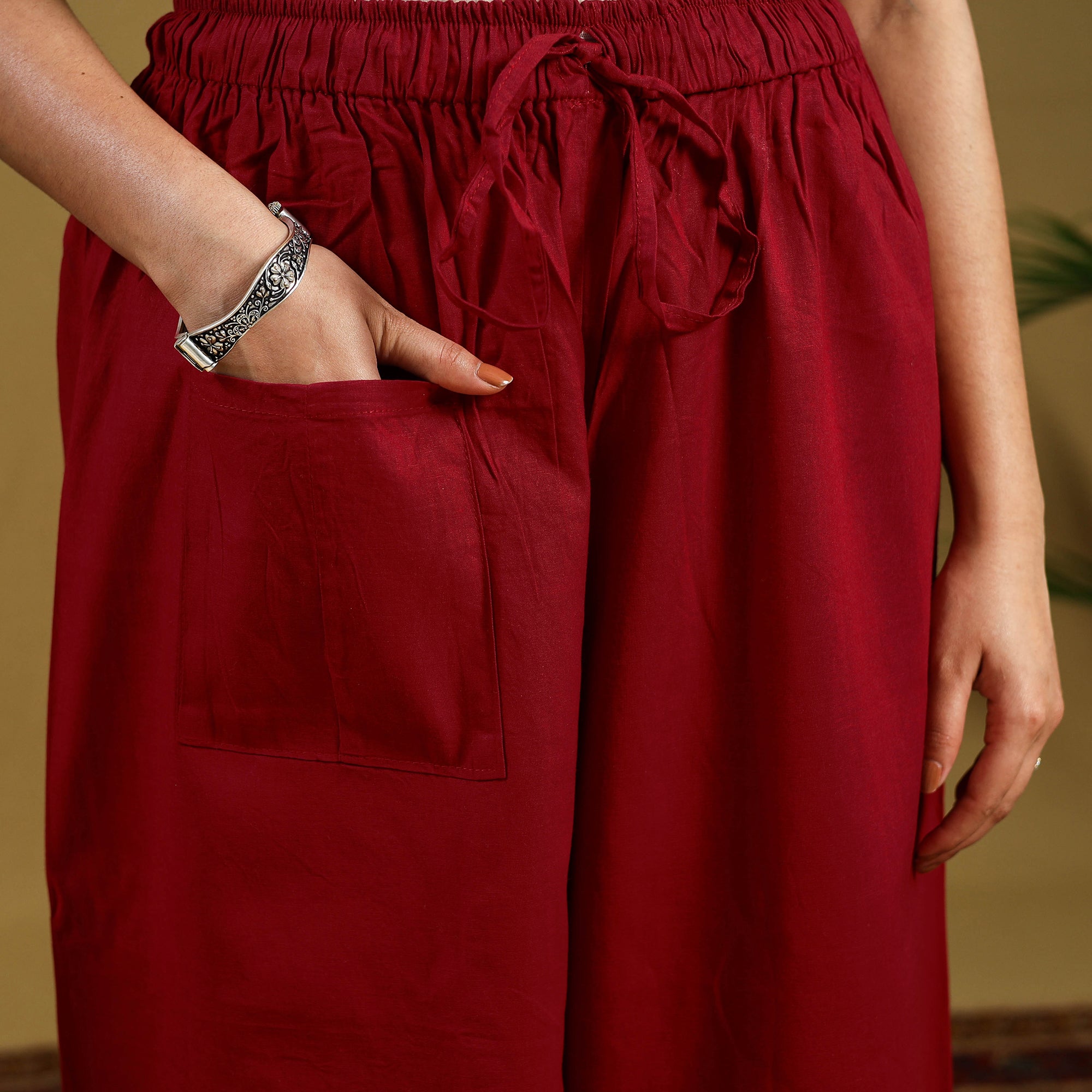 Infuse tradition into your wardrobe with this red cotton palazzo featuring kantha embroidery from Bengal. The delicate hand-stitching on lightweight cotton creates a beautiful fusion of comfort and artistry. Its roomy wide-leg cut ensures day-long ease, ideal for relaxed outings, friendly gatherings, or weekend vibes.