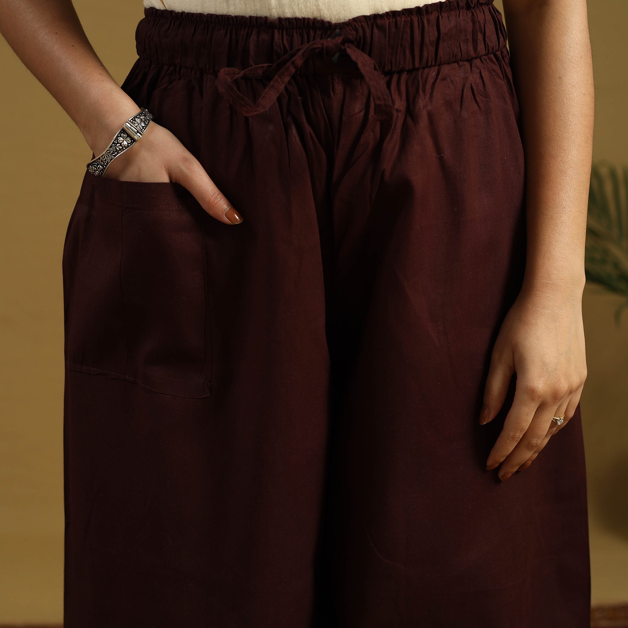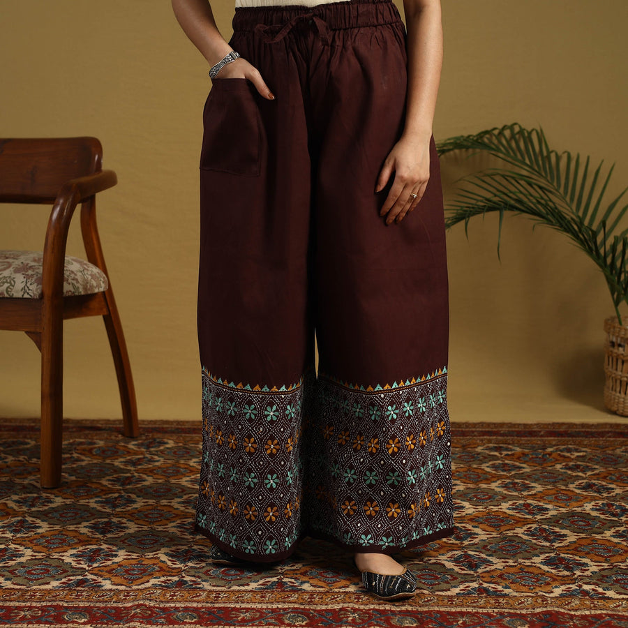 Infuse tradition into your wardrobe with this brown cotton palazzo featuring kantha embroidery from Bengal. The delicate hand-stitching on lightweight cotton creates a beautiful fusion of comfort and artistry. Its roomy wide-leg cut ensures day-long ease, ideal for relaxed outings, friendly gatherings, or weekend vibes.