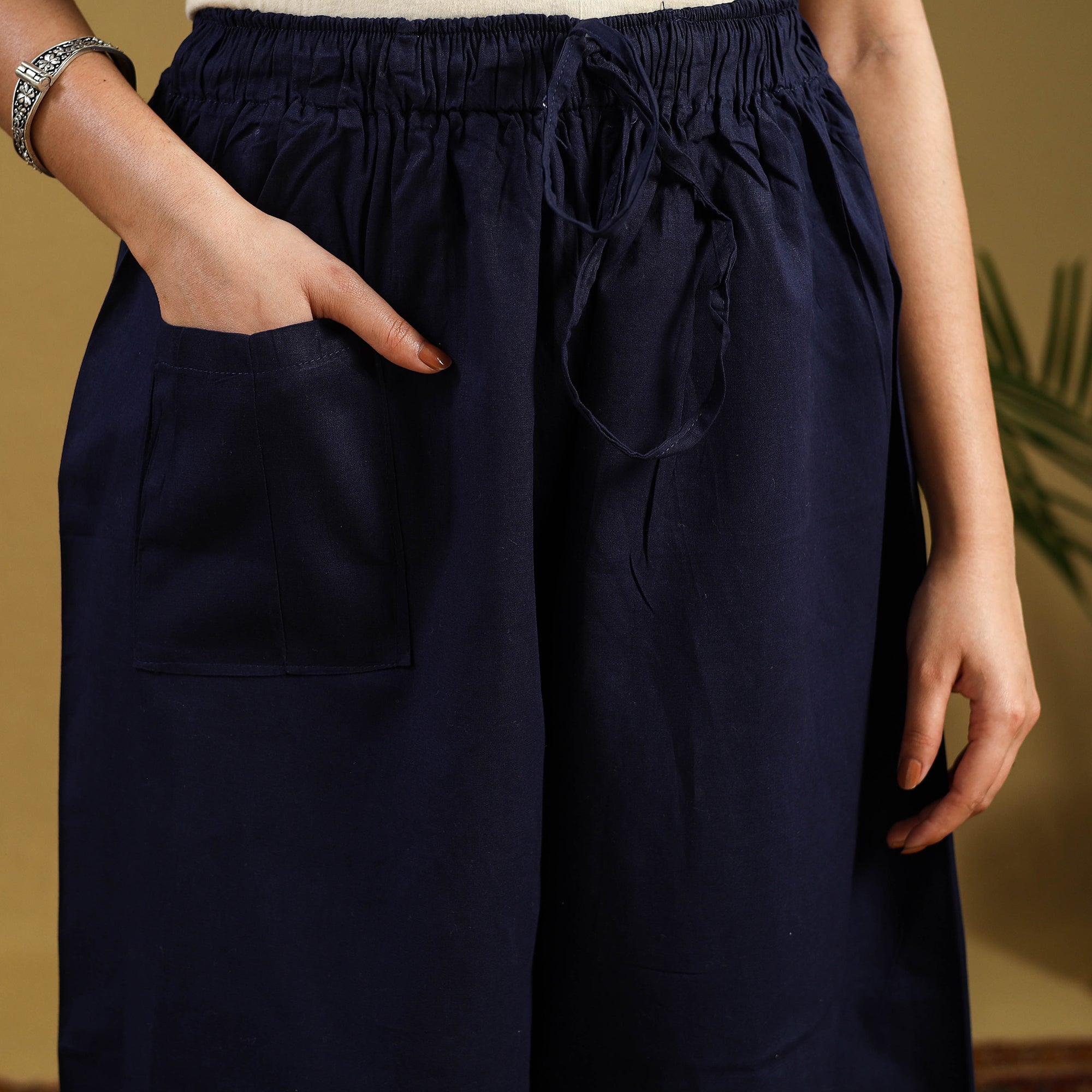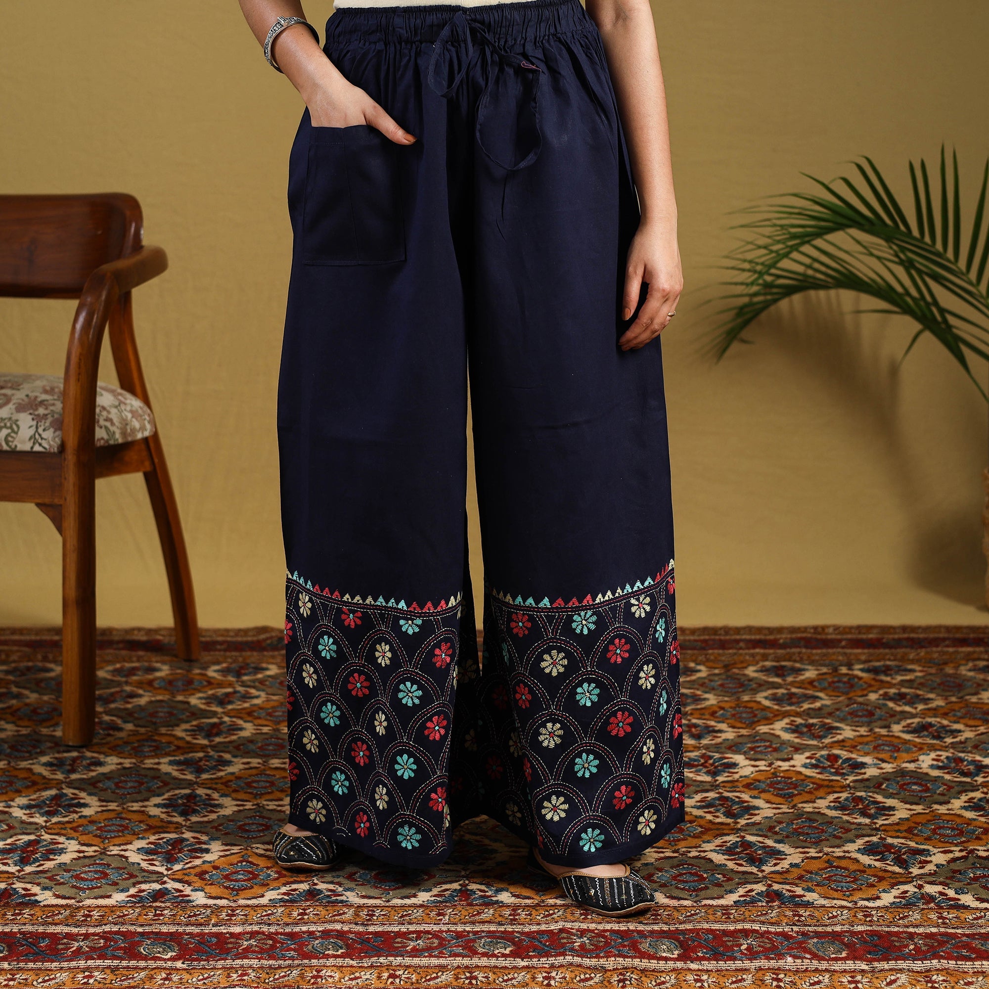 Infuse tradition into your wardrobe with this blue cotton palazzo featuring kantha embroidery from Bengal. The delicate hand-stitching on lightweight cotton creates a beautiful fusion of comfort and artistry. Its roomy wide-leg cut ensures day-long ease, ideal for relaxed outings, friendly gatherings, or weekend vibes.