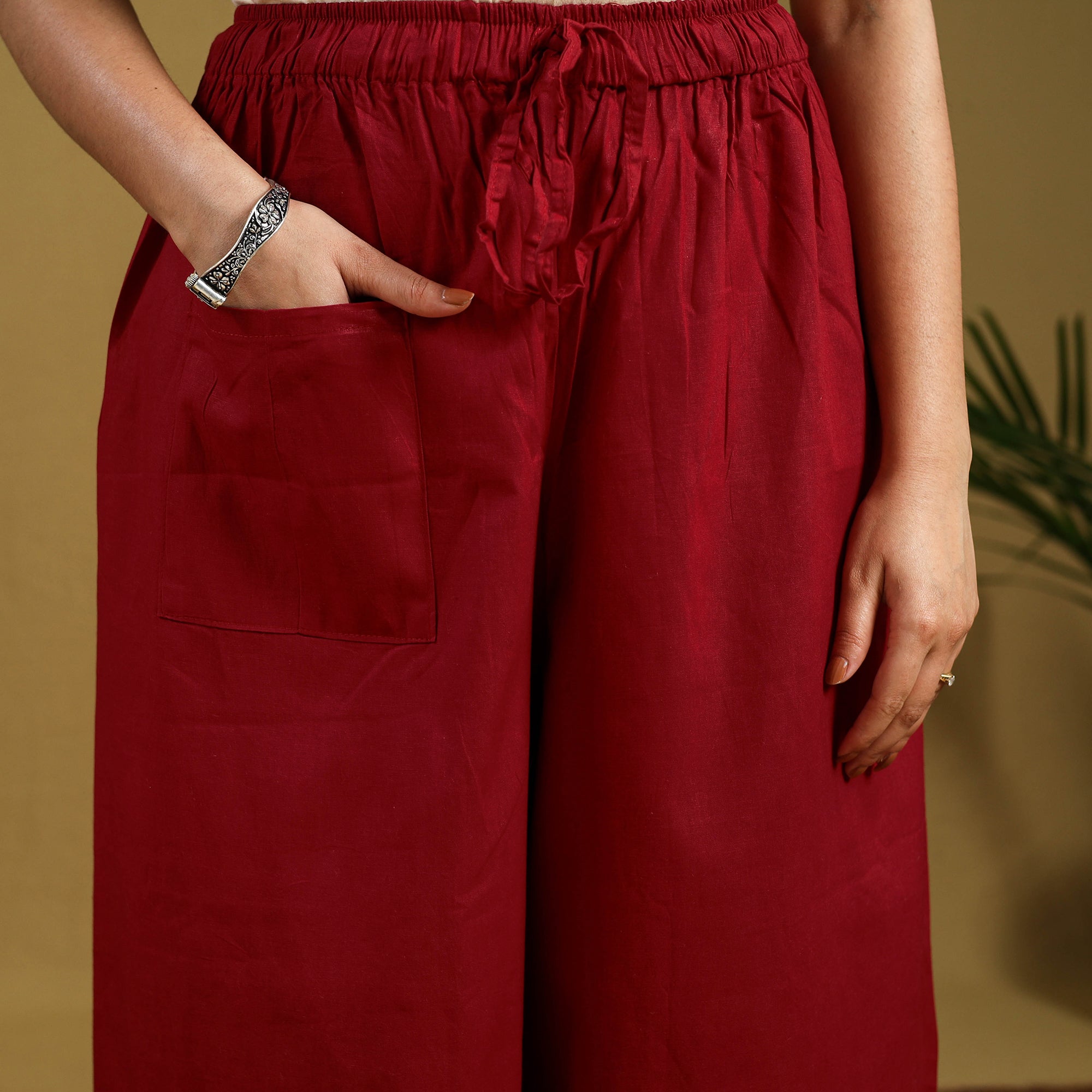 Infuse tradition into your wardrobe with this red cotton palazzo featuring kantha embroidery from Bengal. The delicate hand-stitching on lightweight cotton creates a beautiful fusion of comfort and artistry. Its roomy wide-leg cut ensures day-long ease, ideal for relaxed outings, friendly gatherings, or weekend vibes.