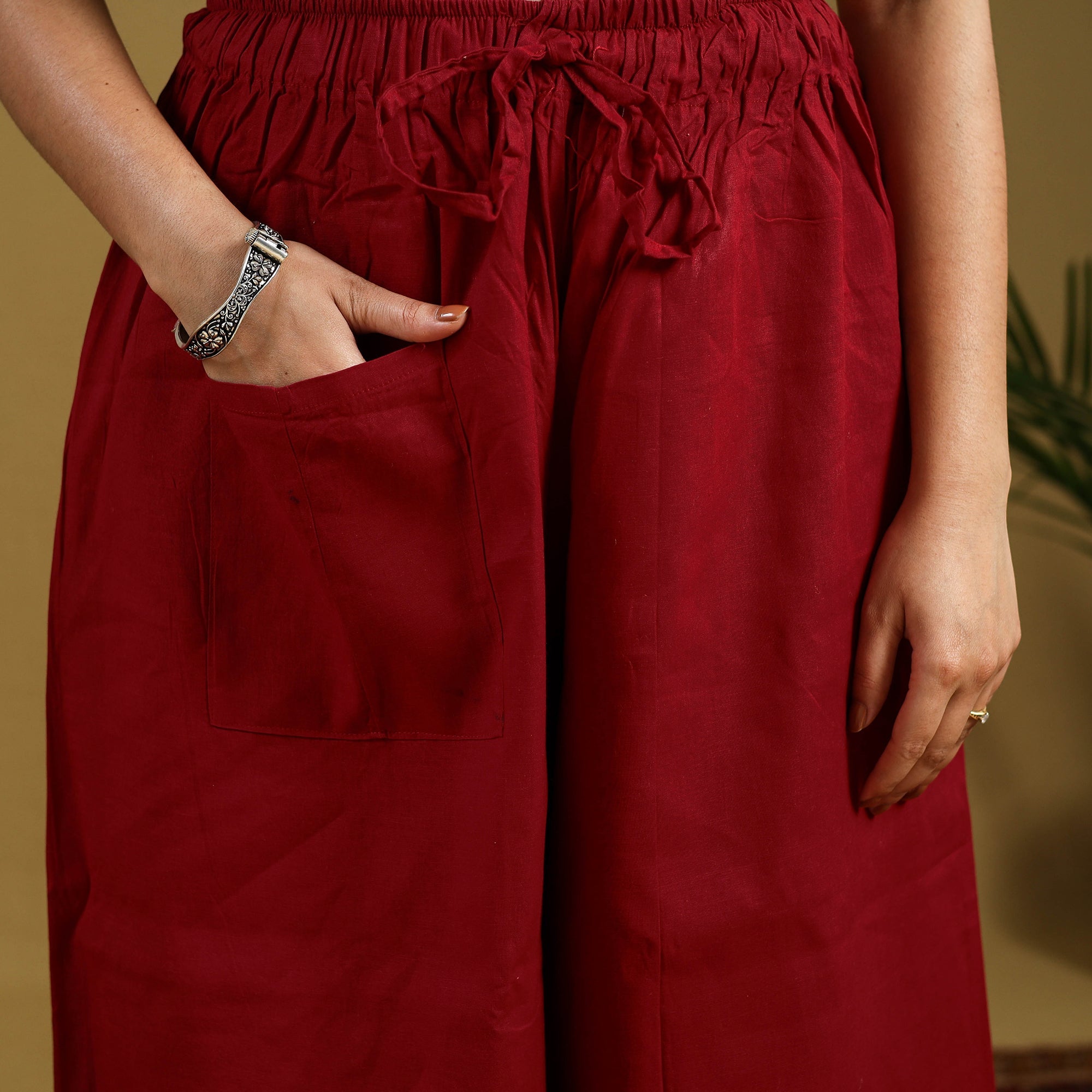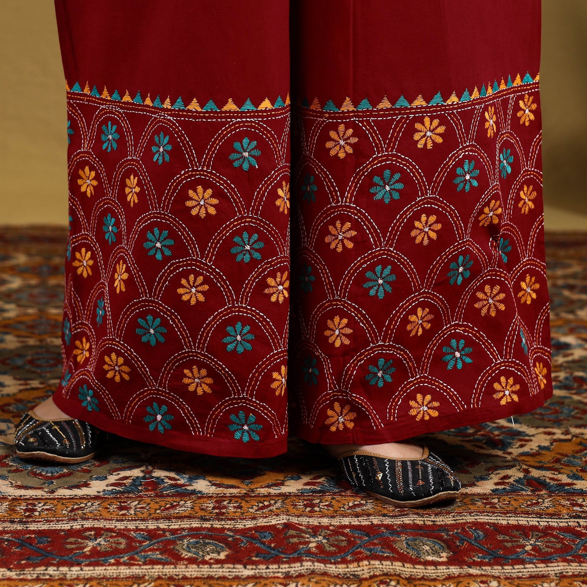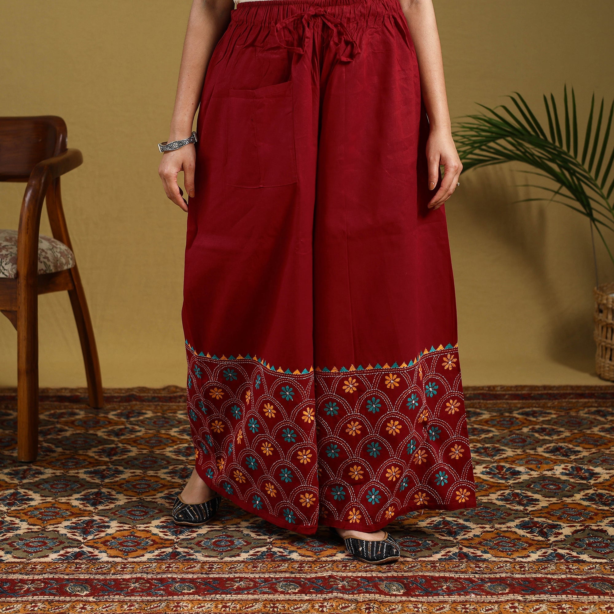 Infuse tradition into your wardrobe with this red cotton palazzo featuring kantha embroidery from Bengal. The delicate hand-stitching on lightweight cotton creates a beautiful fusion of comfort and artistry. Its roomy wide-leg cut ensures day-long ease, ideal for relaxed outings, friendly gatherings, or weekend vibes.